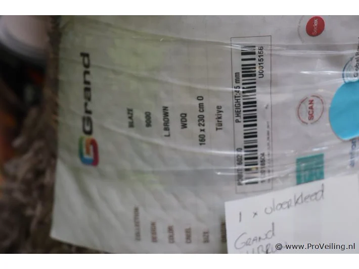 Vloerkleed, ovaal: merk Grand; kleur lichtbruin; hoogpolig; 45mm poolhoogte; afmetingen ca. 160x230cm.
