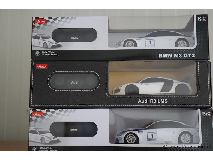 Bestuurbare auto's: merk Rastar; schaal 1:24; diverse soorten o.a. 2x BMW M3 GT2 & 1x Audi R8 LMS; aantal 3 stuks.