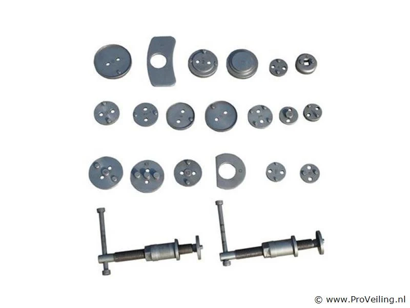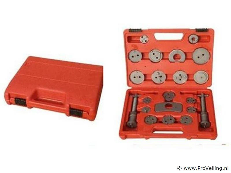Uitgebreide set voor het resetten van de remzuigers van alle gangbare automerken. De meegeleverde links en rechts draaiende spindelremzuigerretour duwt de zuigers zacht en gelijkmatig terug. Dit veroorzaakt geen schade aan afdichtingen of iets anders door ongelijke druk. De set bevat 2 bevestigingsplaten en 17 adapters voor de meest gangbare fabrikanten. Praktisch en overzichtelijk in een kunststof koffer Let op: De set past niet op de Audi A4 Adapter geschikt voor: 0 = General Motors 2 = Citroën XM, Xantia en anderen 3 = Alfa Romeo, Audi, Austin, BMW, Ford, Honda, Jaguar, Mercedes-Benz, Mitsubishi, Nissan, Rover, Toyota, VW 4 = Alfa Romeo 164 2.0, Ford, Mazda, Saab 9000, Subaru 5 = Adapter met 3/8" binnenvierkant 6 = Nissan Primera, VW Golf IV 7 = Audi 80, 90, V8 +100, Ford Sierra ABS + Scorpio vanaf 85, Honda Prelude, Nissan Silvia 1.8 Turbo, Rover 8000, Saab 9000, Subaru L + Z, VW Golf + Passat 8 = General Motors 9 = General Motors A = Renault E = Nissan Cefrio, Maxima V = Opel K = Citroen K1 = Citroen K2 = Citroen, Renault M = Ford N = Saab, Honda Technische specificaties: Materiaal gereedschap: metaal Gewicht - enkel: 2,6 kg Leveringsomvang: 1x rechtsdraaiende spindel 1x linkse spindel 2x bevestigingsplaten 17x adapters 1x kunststof koffer