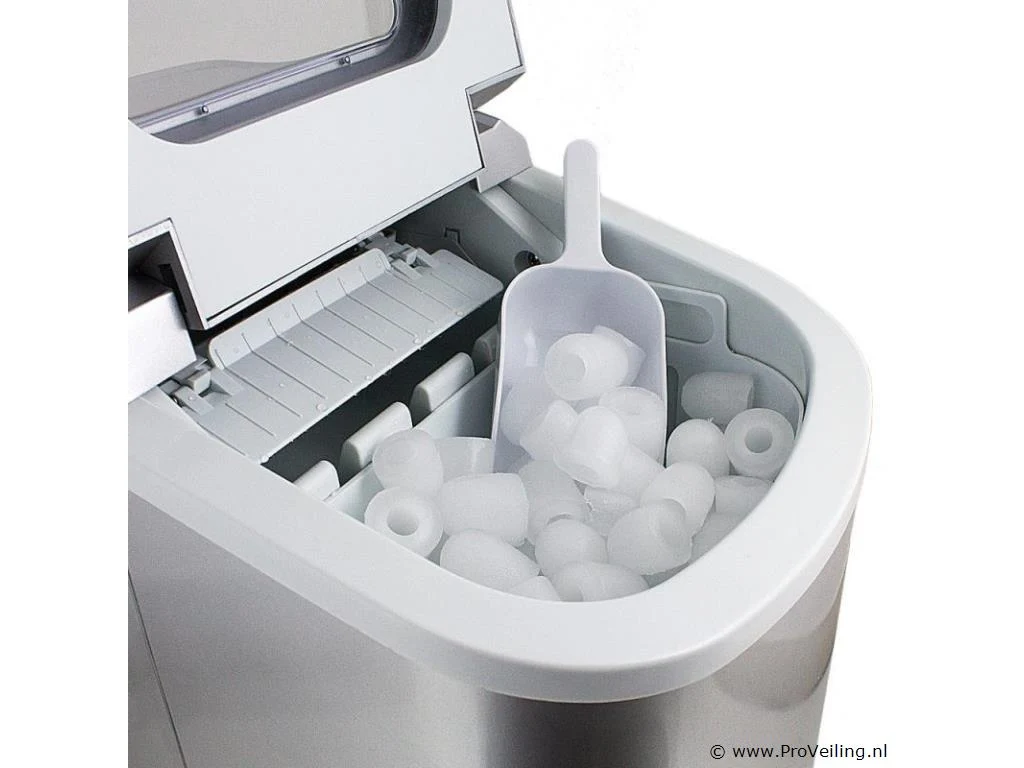 Info: gekoelde opslagbak voor ijsblokjes ca. 6-13 minuten voor een lading ijsblokjes IJs dagelijkse output 10-12kg 2 selecteerbare ijsblokjesmaten Indicatielampje en signaaltoon Hoogwaardig compressorgeluidsniveau (30db) GS getest Technische specificaties: Afmetingen: 350 mm x 250 mm x 325 mm (L/B/H) Watertank: 2,2 liter Gewicht: 7,85 kg Zilver Capaciteit: 0,8 kg ijs Dagelijkse productie: 10 - 12 kg ijs Vermogen: 220-240 volt 50Hz/120 watt Leveringsomvang: 1x ijsblokjesmachine 1x ijsblokjesschep 1x gebruiksaanwijzing