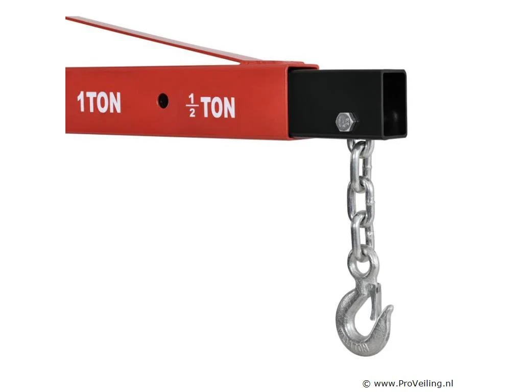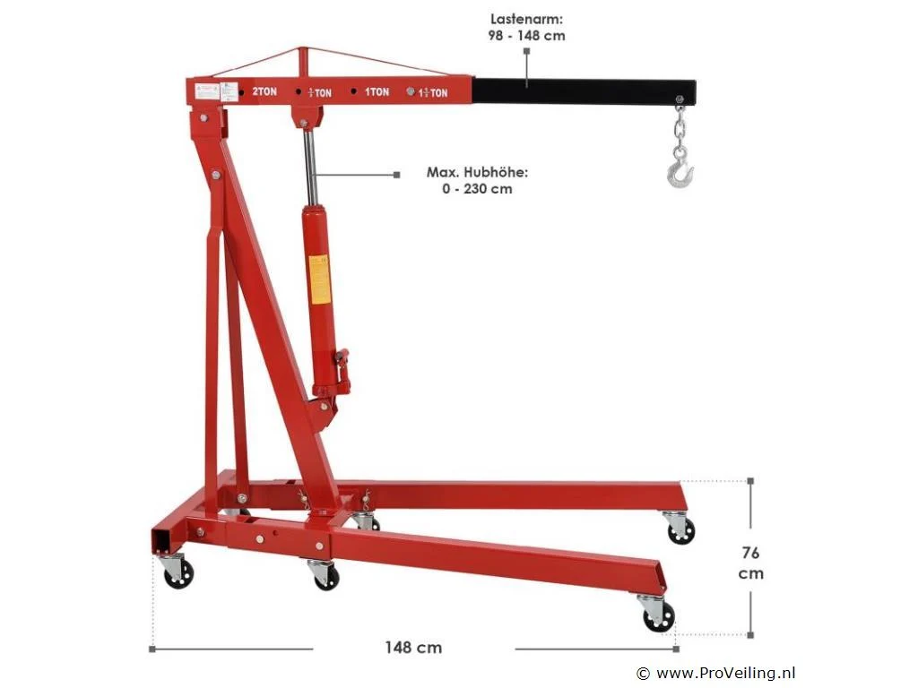 Technische specificaties: Materiaal: staal, gepoedercoat Kleur: rood, zwart Max. Hefcapaciteit: 2000 kg Aantal posities laadarm: 4; 0,5 / 1,0 / 1,5 / 2,0 ton Aantal wielen: 6 Afmetingen (informatie bij benadering in cm): Algemene afmetingen: 148 × 76 Lengte laadarm: 97,5 - 147,5 Max. Hefhoogte: 230 Leveringsomvang: 1 × werkplaatskraan 1 × montage-instructies Dit artikel bestaat uit 3 dozen, het kan logistiek voorkomen dat het in meerdere dagen geleverd wordt.