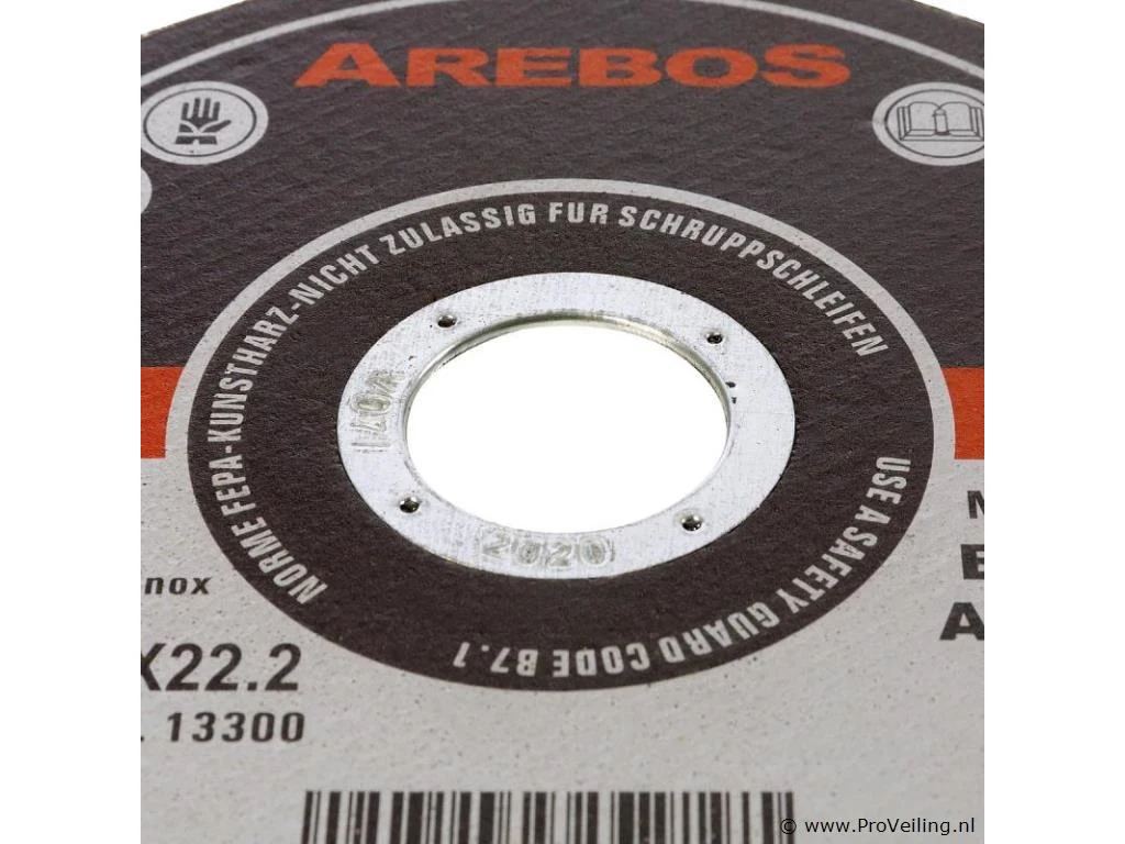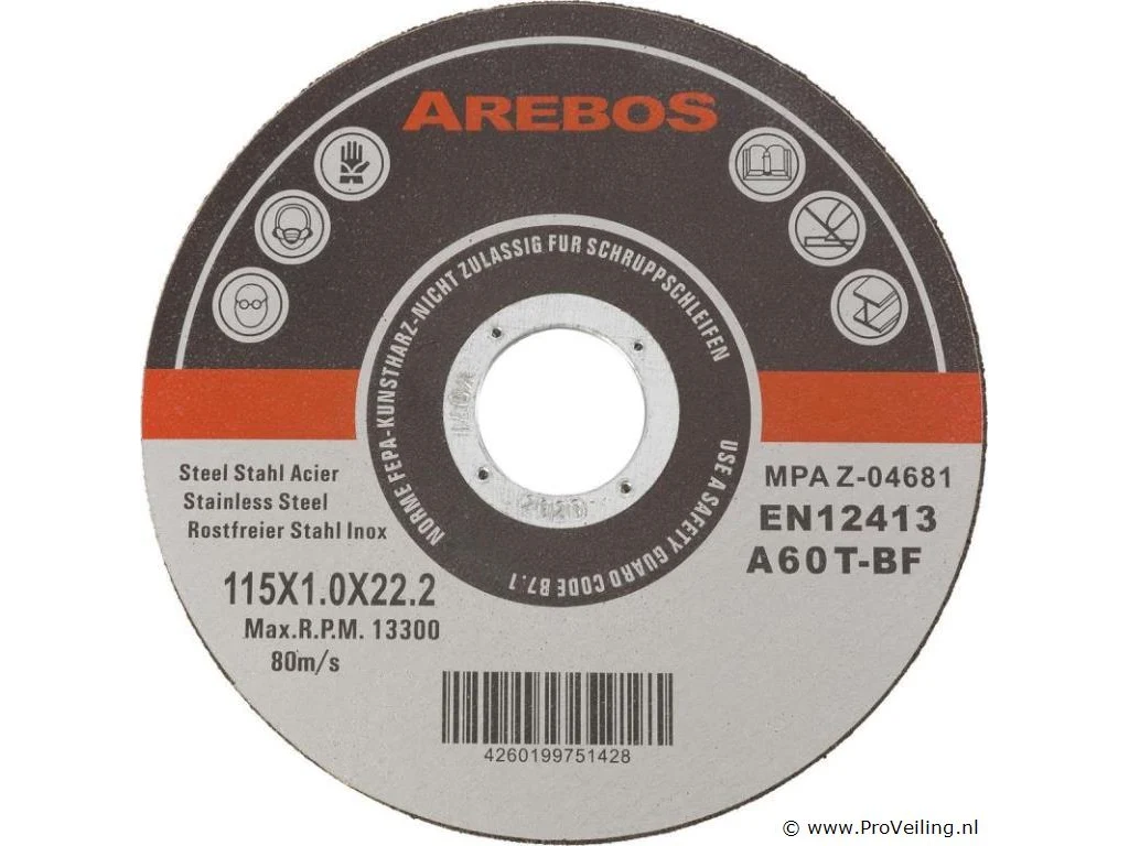 [Compatibiliteit] De AREBOS - doorslijpschijven zijn compatibel met alle gangbare modellen haakse slijpers. Met een schijfdiameter van 115 mm, een boringmaat van 22,2 mm en een dikte van 1mm zijn deze doorslijpschijven geschikt voor een groot aantal toepassingen. [Industriële kwaliteit] De hoogwaardige afwerking is direct merkbaar dankzij gelijkmatig verdeelde slijpkorrels en versterkt veiligheidsgaas. Materialen als ijzer, plaatstaal, metaal, staal en roestvrij staal kunnen probleemloos worden bewerkt. [Schoon en nauwkeurig] Doordat u kunt kiezen tussen voorwaartse en achterwaartse richting, kunt u flexibel een keuze maken op basis van de eisen van uw specifieke project. Ondanks de manier waarop droog doorslijpen werkt, wordt er bij het werken met de AREBOS-doorslijpschijven zeer weinig stof gegenereerd en het is bovendien zeer nauwkeurig. [Hoogste kwaliteits- en veiligheidsnormen] Onze doorslijpschijven voldoen aan de veiligheidsnormen van EN 12413 (de Europese norm 12413). Dit is getest en bevestigd door het materiaaltestinstituut van Hannover (MPA Hannover). [Robuust en veerkrachtig] Dankzij het hoogwaardige staalgaas zijn de doorslijpschijven van AREBOS extreem veerkrachtig, robuust en duurzaam. Met 13300 tpm en 80 m/s kunt u uw klusjes in huis in zeer korte tijd uitvoeren. Waarschijnlijk heeft elke klusser die met metaal werkt wel eens met doorslijpschijven gewerkt. Dankzij hun veelzijdige gebruik kunnen de schijven worden gebruikt voor het bewerken van een breed scala aan materialen. Ze kenmerken zich door een zuivere, nauwkeurige en soepele doorslijpmethode en zijn daarom een 'welkome helpende hand' bij het in- en doorslijpen van dunwandige buizen, balken, dunne metaalplaten en carrosserieplaten. De AREBOS-doorslijpschijven overtuigen door een goed slijpvermogen en een zeer lange levensduur. Daarnaast is er slechts zeer minimaal sprake van braamvorming. Zuiver slijpen en werken tot op de millimeter nauwkeurig is geen probleem met de doorslijpschijven van AREBOS. Onze doorslijpschijven voldoen aan de veiligheidsnormen van EN 12413 (de Europese norm 12413). Dit is getest en bevestigd door het materiaaltestinstituut van Hannover (MPA Hannover). Onze doorslijpschijven zijn geschikt voor alle gangbare haakse slijpers. Ze zijn van industriële kwaliteit en daarom een must voor uw werkplaats. Overtuig uzelf en ontdek de premium kwaliteit en afwerking van AREBOS-producten!