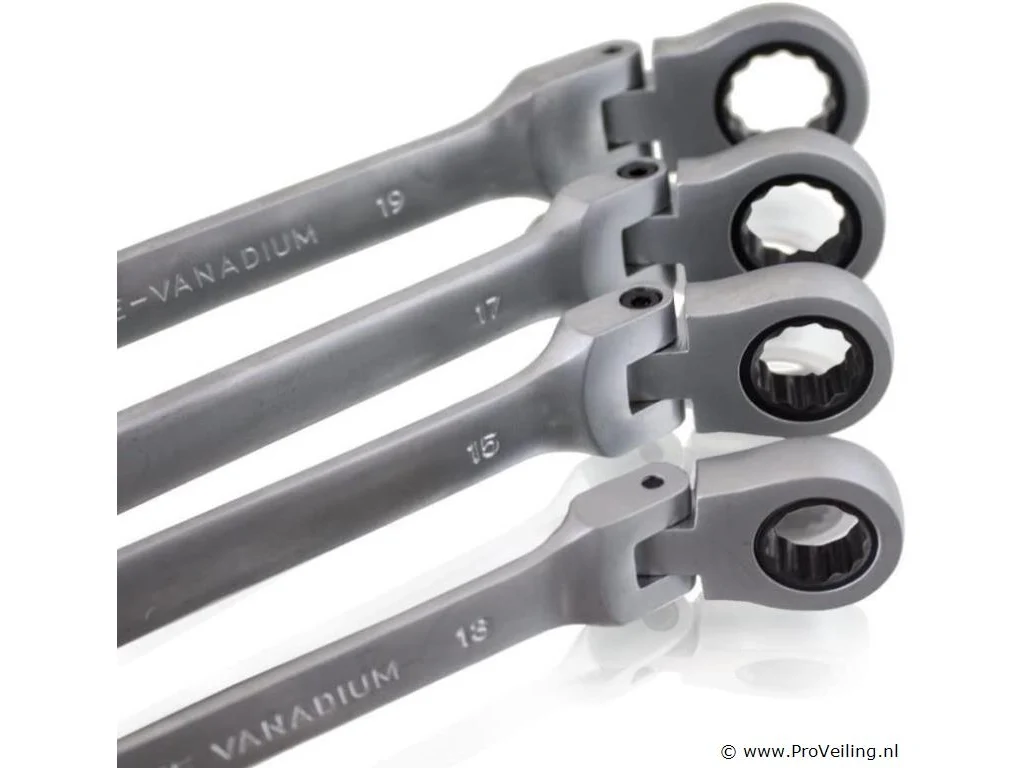 De set bestaat uit 12 ratelsleutels met scharnierkoppen, waarmee je ook op moeilijk bereikbare plaatsen kunt werken. De gereedschappen zijn gemaakt van robuust en duurzaam chroom-vanadiumstaal Ratelsleutels: 6 mm, 7 mm, 8 mm, 9 mm, 10 mm, 11 mm, 12 mm, 13 mm, 14 mm, 15 mm, 17 mm, 19 mm (5 graden terughaalhoek / 72 tanden) Praktisch en overzichtelijk, veilig opgeborgen in de kunststof koffer Technische specificaties: Maten: 6 mm, 7 mm, 8 mm, 9 mm, 10 mm, 11 mm, 12 mm, 13 mm, 14 mm, 15 mm, 17 mm, 19 mm Aantal tanden: 72 Resethoek: 5 graden Materiaal kast: kunststof Gereedschapsmateriaal: chroom-vanadiumstaal Leveringsomvang: 1x ratelsleutel met scharnier: 6 mm, 7 mm, 8 mm, 9 mm, 10 mm, 11 mm, 12 mm, 13 mm, 14 mm, 15 mm, 17 mm, 19 mm