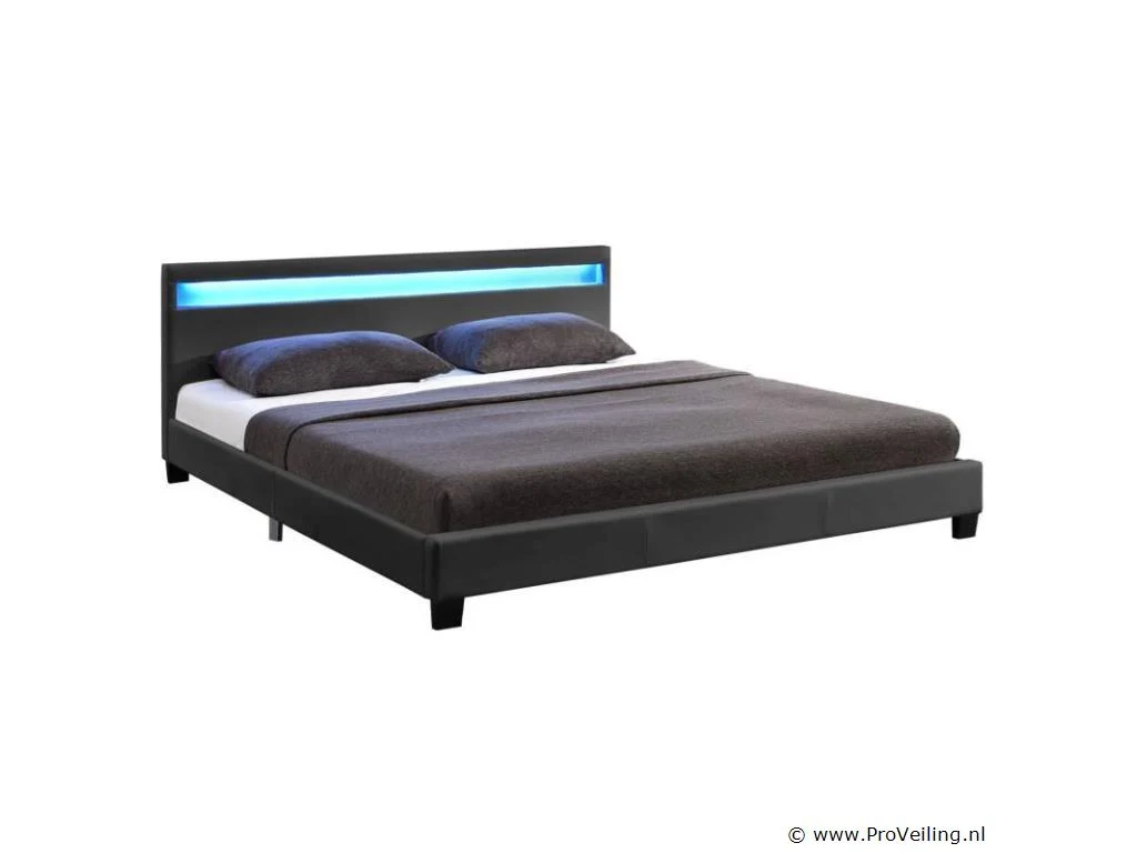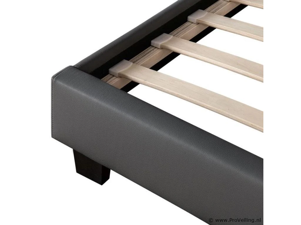 Het gestoffeerde bed Paris (140x200 cm, donkergrijs) is een echte meevaller. Op de combinatie van bedframe en lattenbodem slaap je heerlijk comfortabel en rustig. De lattenbodem biedt het ideale ligvlak voor je matras van 140x200 cm, die zowel voor jongeren als volwassenen uitstekend geschikt is. Het ruimtebesparende formaat maakt hem perfect voor kleine slaapkamers of logeerkamers. Leunend tegen het comfortabel gestoffeerde hoofdeinde kunt u ook ontspannen lezen of tv kijken. Het heeft een geïntegreerde LED-strip waarvan het licht een prachtig effect heeft op het donkergrijze kunstleer en de ruimte een geweldige flair geeft. Technische specificaties: Producttype: bedframe Kleur: donkergrijs Stijl: Modern Materiaal frame: MDF hout, metaal Materiaal bekleding: kunstleer (84% PVC, 16% polyester) Verlichting: LED-strip met afstandsbediening Lichtkleur: 16 verschillende kleuren Vermogen: 14,3 W Lichtstroom: 234 lm Kleurtemperatuur: 2000 - 10000K Afmetingen (ongeveer): Afmetingen: 145 x 213 cm Ligoppervlak: 140 × 200 cm Hoogte hoofdeinde: 78 cm Dikte hoofdbord: 7 cm Hoogte bedframe: 15 cm Dikte voetstuk: 5 cm Voeten: 8 cm Opmerkingen over de lichtbron: Het product bevat LED-verlichting. De meegeleverde LED-verlichting is alleen bedoeld voor scène-/accentverlichting en is niet geschikt voor andere toepassingen. De meegeleverde lampen zijn niet uitwisselbaar, maar uitneembaar. De meegeleverde LED-verlichting is via een IR-afstandsbediening in te stellen en te dimmen. De meegeleverde LED-verlichting moet worden afgevoerd in overeenstemming met de richtlijn afgedankte elektrische en elektronische apparatuur. Leveringsomvang: 1 x gestoffeerd bed 1 x lattenbodem 1 x afstandsbediening 1 x Instructie Let op: De matras is niet inbegrepen. Je ontvangt het product goed verpakt als bouwpakket voor zelfmontage per pakketdienst. Let op!!! Onderdelen kunnen zich in het hoofdbord bevinden.