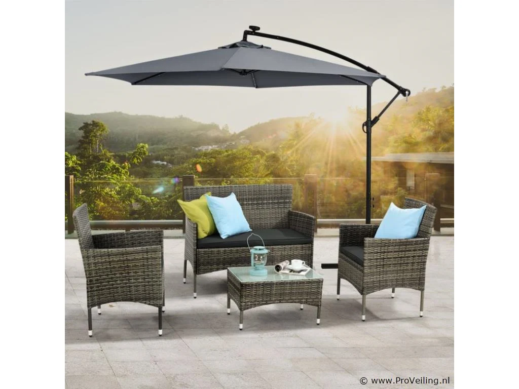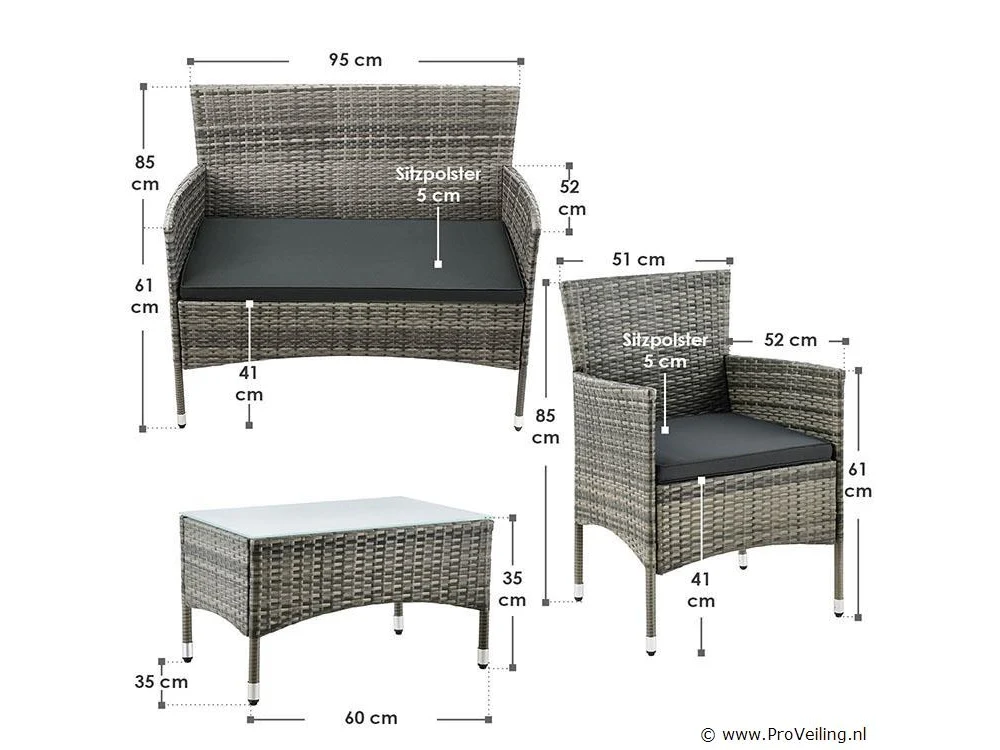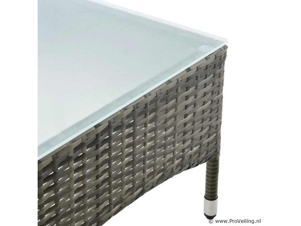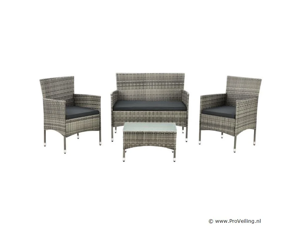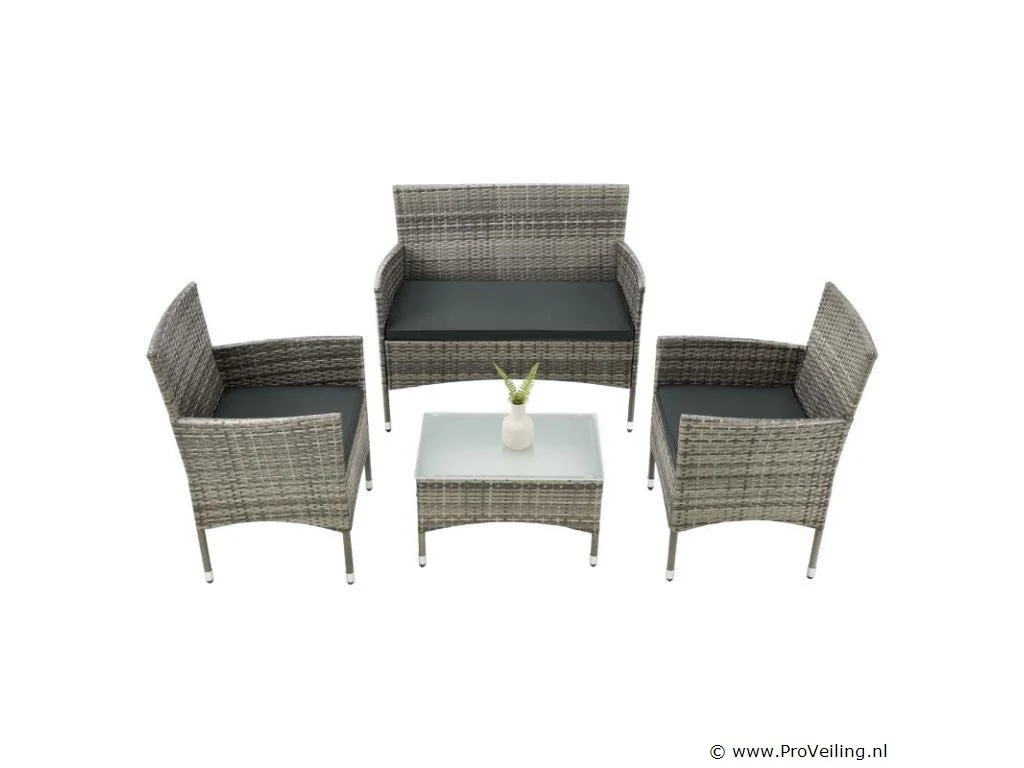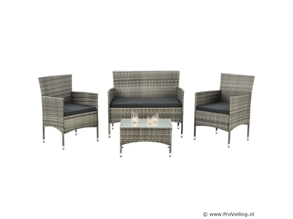 De Fort Myers poly rotan zitgroep (grijs gemêleerd met donkergrijze hoezen) dient als comfortabele lounge voor 4 personen. Met de edele rotan-look verfraait hij elke tuin, terras of balkon. Uitgerust met een rugleuning en kussens, is de tuinset perfect om vele uren door te brengen met familie en vrienden. De 4-delige tuinmeubelset met een stevig metalen frame bestaat uit een 2-zitsbank, twee fauteuils en een kleine bijzettafel met glazen blad. De balkonset is geschikt om gasten in stijl te ontvangen. Zet drankjes en hapjes op tafel en geniet samen van de zomer. Technische specificaties: Materiaal frame: staal, gepoedercoat Materiaal weefsel: polyrotan, gevlochten Materiaal zitkussens: schuim Materiaal hoezen: polyester Materiaal glasplaat: glas (veiligheidsglas) Vlechtkleur: grijs gemêleerd Kleur bekleding: donkergrijs Aantal zitplaatsen: Voor 4 personen Stijl, design: moderne rotan-look Afmetingen (ongeveer): Afmetingen tuintafel: 60 × 35 × 35 cm Afmeting bank: 95 × 52 × 85 cm Afmetingen tuinstoelen: 51 × 52 × 85 cm Hoogte rugleuning vanaf vloer: 85 cm Hoogte armleuning vanaf vloer: 61 cm Zithoogte zonder bekleding: 41 cm Dikte zitkussen: 5 cm Leveringsomvang: 1 x glazen tafel 2 x stoelen 1 x 2-zits zitbank 1 x groot zitkussen 2 x kleine zitkussens 1 x montagehandleiding