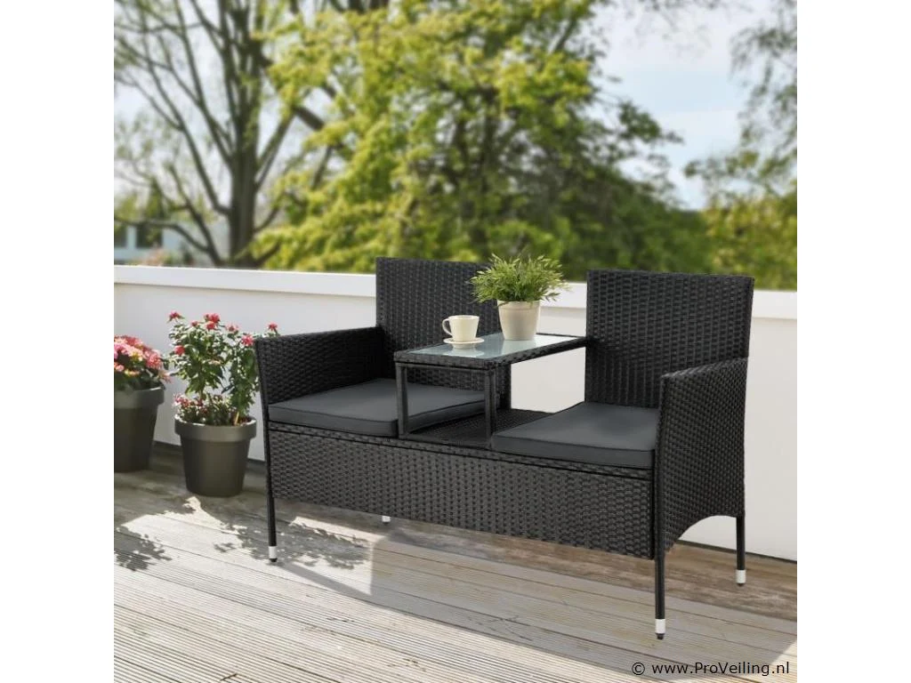 Bent u op zoek naar een stijlvolle zitgelegenheid voor uw balkon, tuin of terras die comfortabel en ruimtebesparend is? Kies dan voor de moderne polyrotan bank Monaco in zwart met donkergrijze zitkussens. De kleine tuinbank voor 2 personen neemt buiten maar weinig ruimte in beslag (133 × 63 × 84 cm) en is daarom ideaal als balkonmeubel. Ook bij de vijver, het zwembad of onder een boom oogt de 2-zitsbank in rotan-look modern en tijdloos. Het trendy vlechtwerk van polyrattan is onderhoudsvriendelijk en zorgt samen met het dikke zitkussen voor een zachte zitervaring. Zet drankjes of snacks op het kleine tafeltje in het midden. Technische specificaties: Materiaal gaas: polyrotan Materiaal frame: staal Materiaal tafelblad: glas Materiaal bekleding: schuim Materiaal hoezen: polyester Vlechtkleur: zwart Kleur kussensloop: donkergrijs Aantal zitplaatsen: 2 Hoezen wasbaar: ja Weerbestendig: ja Afmetingen (ongeveer): Totale afmetingen (BxDxH): 133 × 63 × 84 cm Zitkussen: 5 cm hoog Hoogte van de glasplaat: 0,5 cm Leveringsomvang: 1 x poly rotan bank 1 x geïntegreerde tafel 2 x zitkussens 1 x Instructie De poly rattan zitgroep wordt geleverd als bouwpakket voor zelfmontage per pakketdienst.