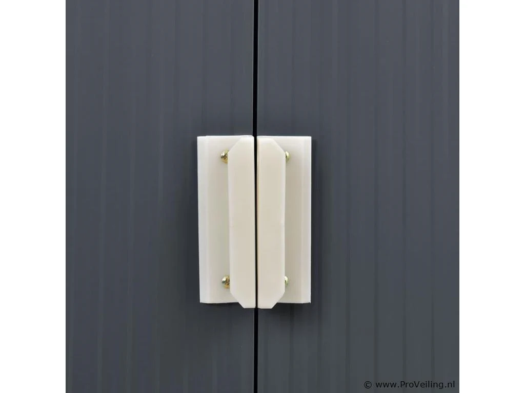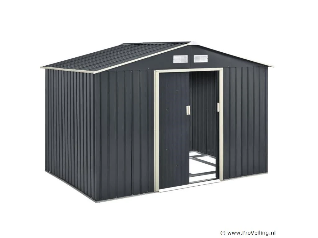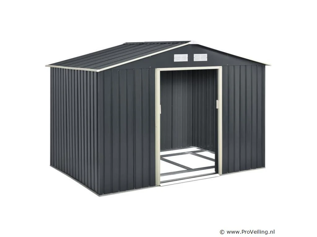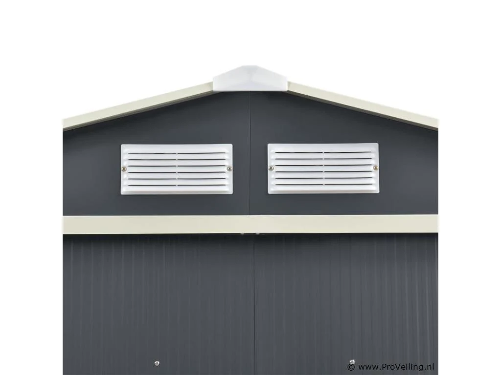 Creëer orde in je tuin - met de moderne XL metalen gereedschapsschuur met schuin dak. Maak een einde aan roestig tuingereedschap of lelijke geïmproviseerde hoezen. Tuinmeubelen, tuingereedschap en fietsen vinden een beschutte plek in de ruime gereedschapsschuur. Zo berg je je outdoor spullen droog, schoon en netjes op. Een onderstel van metaal en een praktische dubbele schuifdeur maken de uitrusting compleet. Nog een pluspunt: ventilatieroosters zorgen voor een goede luchtcirculatie. Technische specificaties: Materiaal tuinhuisje: plaatstaal, kunststof Materiaal fundering: metalen frame Kleur antraciet Bergruimte: ca. 9 m³ Afmetingen (ongeveer): Totale afmetingen: 277 × 191 × 192 cm Interne afmetingen: 267 × 181 × 187 cm Afmetingen voet: 267 × 181 cm Nokhoogte: 192 cm Hoogte dakrand: 152 cm Deur: 96 x 152 cm Leveringsomvang: 1 x metalen gereedschapsschuur 1 x funderingsframe 1 x montage-instructies Dit artikel bestaat uit 3 dozen, het kan logistiek voorkomen dat het in meerdere dagen geleverd wordt.