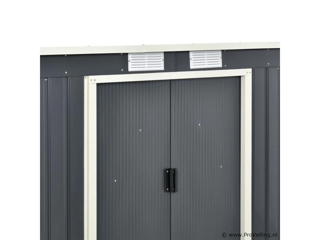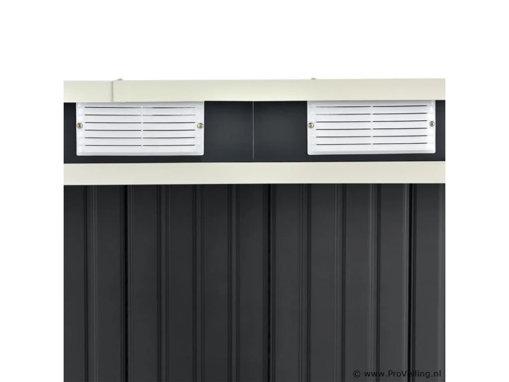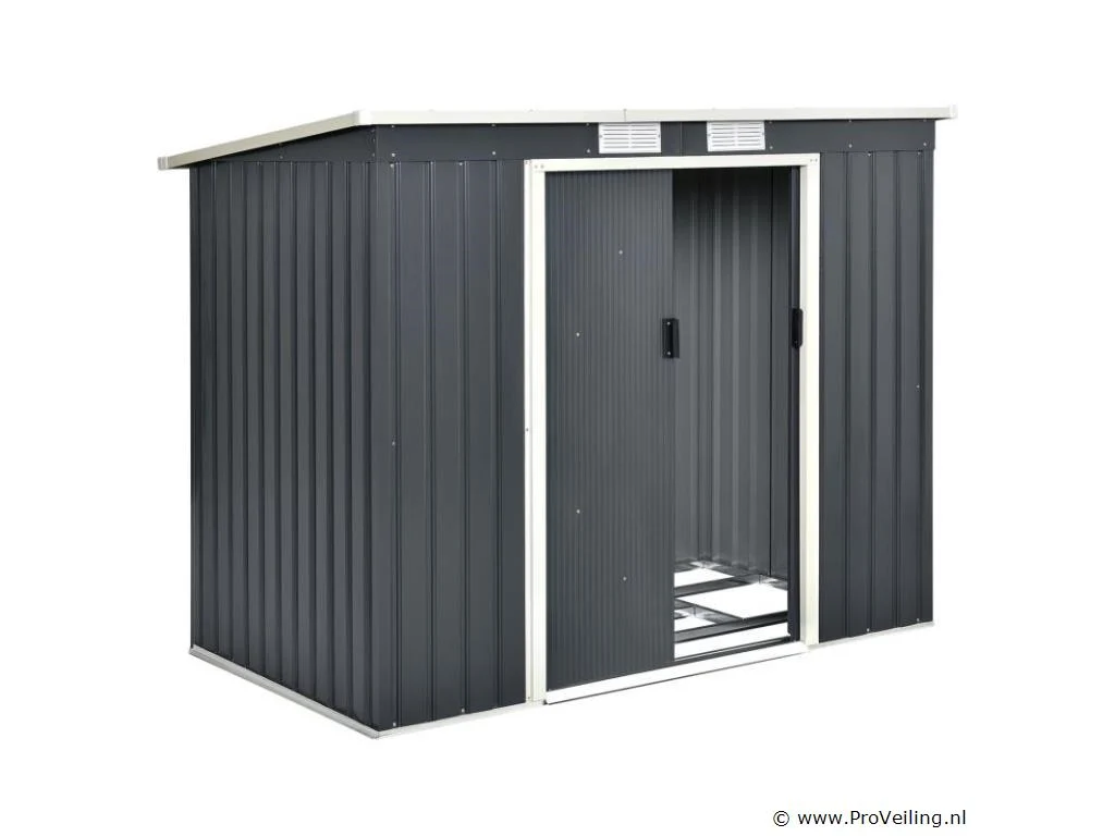 Creëer orde in je tuin - met de moderne metalen gereedschapsschuur met lessenaarsdak in maat M. Maak een einde aan roestig tuingereedschap of lelijke geïmproviseerde afdekkingen. Tuinmeubelen, tuingereedschap en fietsen vinden een beschutte plek in de ruime gereedschapsschuur. Zo berg je je outdoor spullen droog, schoon en netjes op. Een basisframe van metaal en een praktische dubbele schuifdeur ronden de uitrusting af. Nog een pluspunt: ventilatieroosters zorgen voor een goede luchtcirculatie. Technische specificaties: Materiaal tuinhuisje: plaatstaal, kunststof Materiaal fundering: metalen frame Kleur antraciet Bergruimte: ca. 4 m³ Afmetingen (ongeveer): Totale afmetingen: 213 × 130 × 173 cm Binnenafmetingen: 203 × 117 × 170 cm Afmetingen voet: 203 × 117 cm Nokhoogte: 173 cm Hoogte dakrand: 152 cm Deur: 96 x 152 cm Leveringsomvang: 1 x metalen gereedschapsschuur 1 x funderingsframe 1 x montagehandleiding