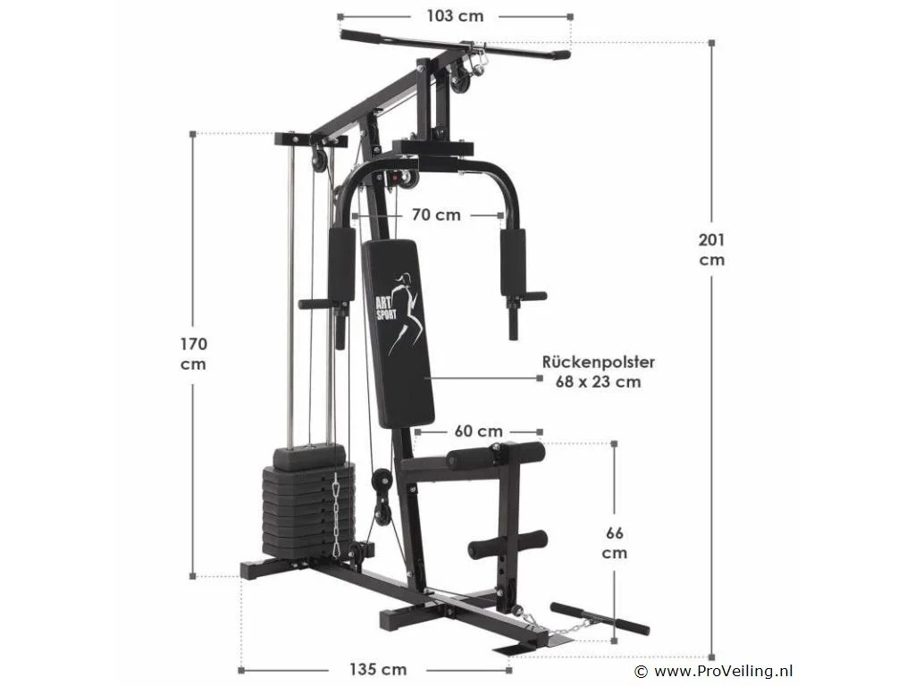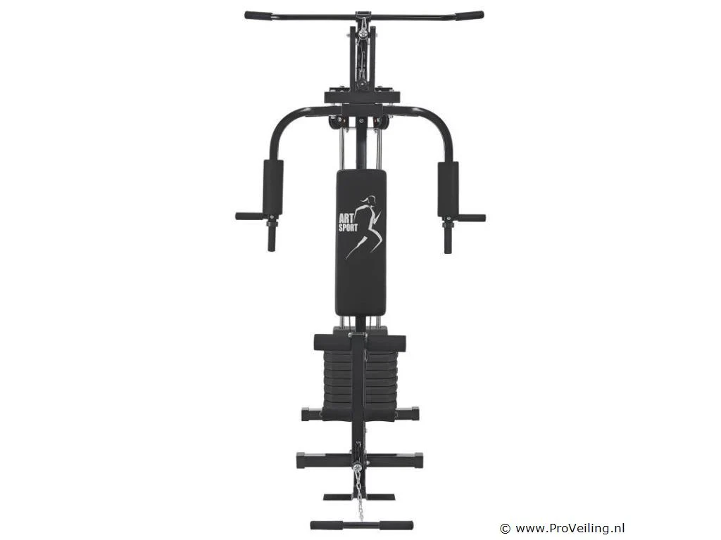 Uw persoonlijke fitnessstudio voor thuis: het ArtSport krachtstation ProfiGym 2000. Met dit krachtstation traint u effectief uw hele lichaam - ideaal voor uw intensieve thuistraining. De doordachte hometrainer is extreem ruimtebesparend en combineert meerdere sporttoestellen in één. Vervolg uw trainingsplan binnen uw eigen vier muren: bevorder spierdefinitie door gevarieerde fitnessoefeningen voor het boven- en onderlichaam. Pas de intensiteit eenvoudig aan naarmate je vordert met behulp van de halterschijven. Het trainingsstation is daarom ideaal voor dames en heren. Technische specificaties: Materiaal krachtstation: staal Materiaal zit- en rugkussens: PE-schuim, PVC-leer De kleur zwart Plaatgewicht: 8 × 4,5 kg Gewicht bovenplaat: 1 × 4,3 kg Totaal halterschijven: 40,3 kg Afmetingen (ongeveer): Totale afmetingen: 135 × 103 × 201 cm Leveringsomvang: 1 x krachtstation van ArtSport 1 x vlinderstang 1 x lat pulldown stang 1 x biceps katrol 9 x halterschijven 1 × Instructie