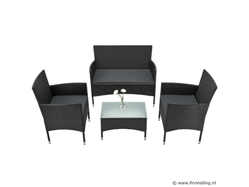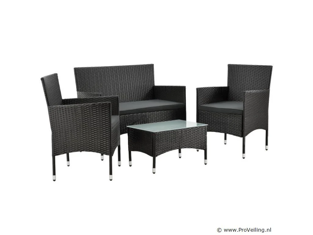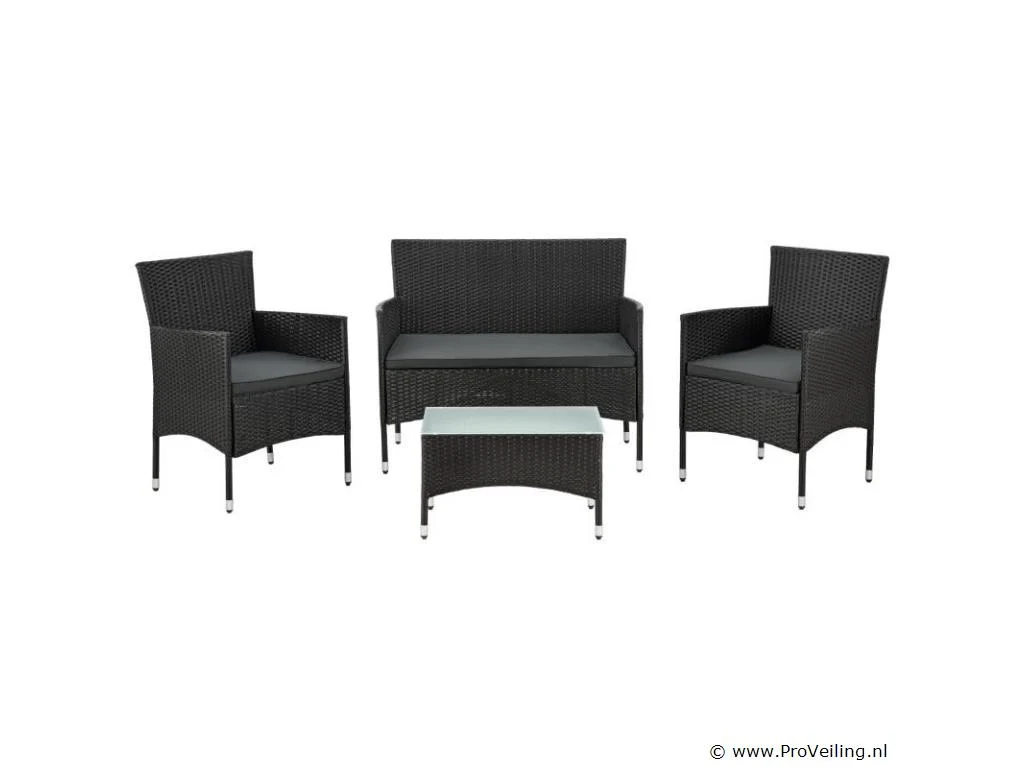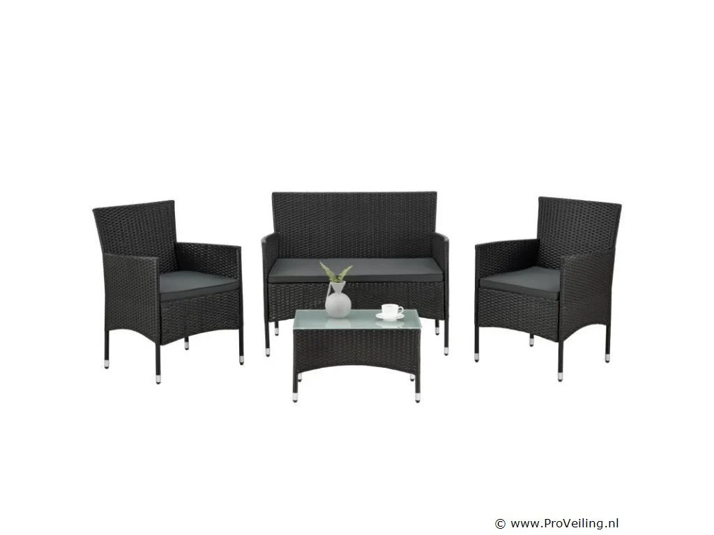De poly rotan zitgroep Fort Myers (zwart met donkergrijze hoezen) dient als comfortabele lounge voor 4 personen. Met de edele rotan-look verfraait hij elke tuin, terras of balkon. Uitgerust met een rugleuning en kussens, is de tuinset perfect om vele uren door te brengen met familie en vrienden. De 4-delige tuinmeubelset met een stevig metalen frame bestaat uit een 2-zitsbank, twee fauteuils en een kleine bijzettafel met glazen blad. De balkonset is geschikt om gasten in stijl te ontvangen. Zet drankjes en hapjes op tafel en geniet samen van de zomer. Technische specificaties: Materiaal frame: staal, gepoedercoat Materiaal weefsel: polyrotan, gevlochten Materiaal zitkussens: schuim Materiaal hoezen: polyester Materiaal glasplaat: glas (veiligheidsglas) Vlechtkleur: zwart Kleur bekleding: donkergrijs, antraciet Aantal zitplaatsen: Voor 4 personen Stijl, design: moderne rotan-look Afmetingen (ongeveer): Afmetingen tuintafel: 60 × 40 × 35 cm (BxDxH) Afmetingen bank: 86 × 51 × 84 cm (BxDxH) Afmetingen tuinstoelen: 42 × 51 × 84 cm (BxDxH) Hoogte rugleuning vanaf vloer: 84 cm Hoogte armleuning vanaf vloer: 62 cm Zithoogte zonder bekleding: 42 cm Dikte zitkussen: 5 cm Leveringsomvang: 1 x glazen tafel 2 x stoelen 1 x 2-zits zitbank 1 x groot zitkussen 2 x kleine zitkussens 1 x montagehandleiding