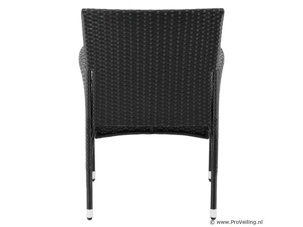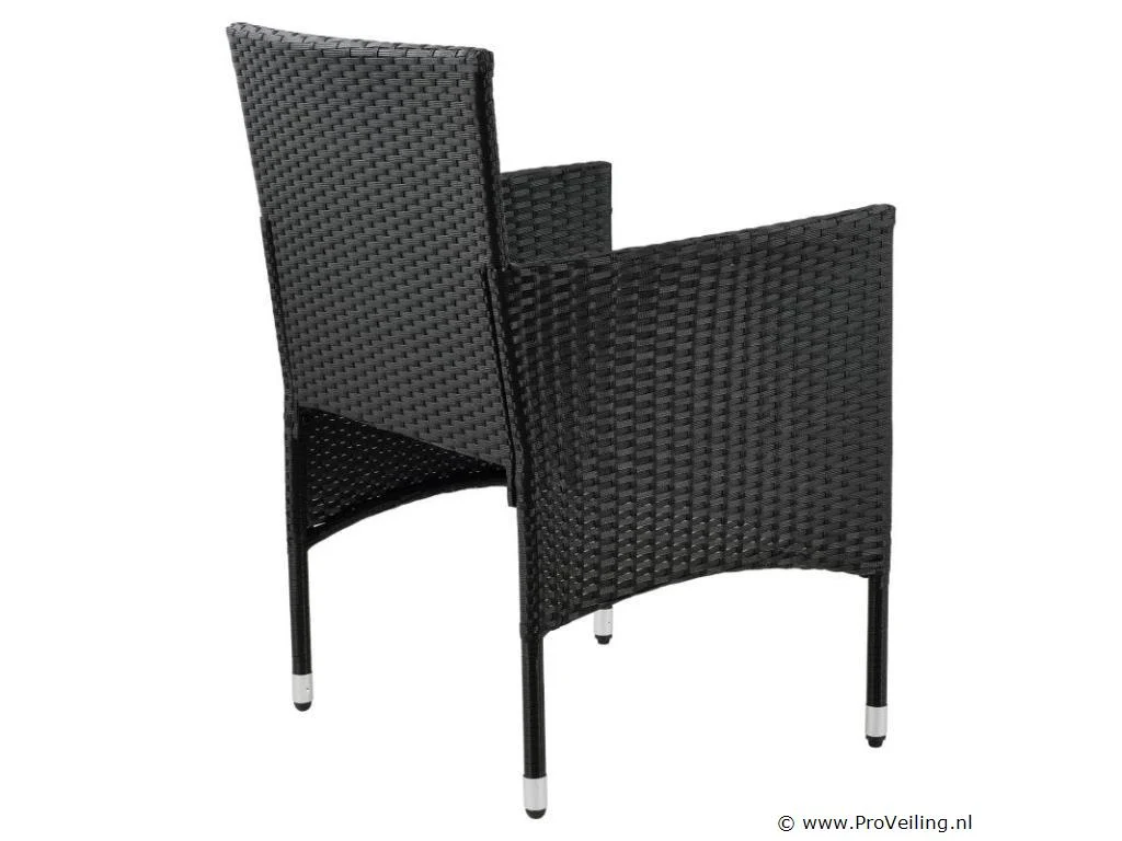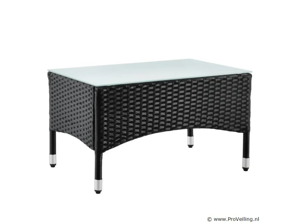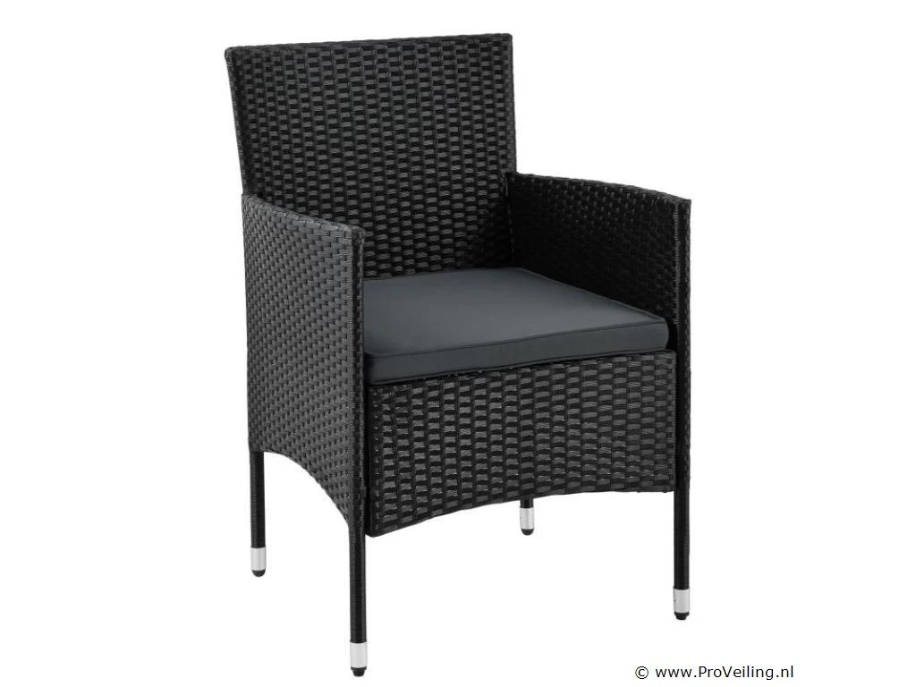 De poly rotan zitgroep Fort Myers (zwart met donkergrijze hoezen) dient als comfortabele lounge voor 4 personen. Met de edele rotan-look verfraait hij elke tuin, terras of balkon. Uitgerust met een rugleuning en kussens, is de tuinset perfect om vele uren door te brengen met familie en vrienden. De 4-delige tuinmeubelset met een stevig metalen frame bestaat uit een 2-zitsbank, twee fauteuils en een kleine bijzettafel met glazen blad. De balkonset is geschikt om gasten in stijl te ontvangen. Zet drankjes en hapjes op tafel en geniet samen van de zomer. Technische specificaties: Materiaal frame: staal, gepoedercoat Materiaal weefsel: polyrotan, gevlochten Materiaal zitkussens: schuim Materiaal hoezen: polyester Materiaal glasplaat: glas (veiligheidsglas) Vlechtkleur: zwart Kleur bekleding: donkergrijs, antraciet Aantal zitplaatsen: Voor 4 personen Stijl, design: moderne rotan-look Afmetingen (ongeveer): Afmetingen tuintafel: 60 × 40 × 35 cm (BxDxH) Afmetingen bank: 86 × 51 × 84 cm (BxDxH) Afmetingen tuinstoelen: 42 × 51 × 84 cm (BxDxH) Hoogte rugleuning vanaf vloer: 84 cm Hoogte armleuning vanaf vloer: 62 cm Zithoogte zonder bekleding: 42 cm Dikte zitkussen: 5 cm Leveringsomvang: 1 x glazen tafel 2 x stoelen 1 x 2-zits zitbank 1 x groot zitkussen 2 x kleine zitkussens 1 x montagehandleiding