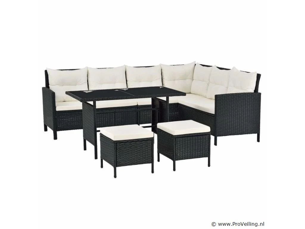 Met de Manacor polyrattan loungeset verander je je tuin, terras of balkon in een stijlvolle plek om te relaxen en je goed te voelen. De grote tuinlounge met een bank, 2 krukken en een tafel is geschikt voor maximaal 7 personen. Zachte zit- en rugkussens zorgen voor een comfortabele zitervaring. De grote eettafel is beschikbaar om te dineren of bordspellen. Gezellige avonden met familie, vrienden of buren worden een geweldige belevenis in de buitenlucht. De unieke rotan-look geeft de tuinmeubelset een moderne charme. Technische specificaties: Materiaal frame: staal, gepoedercoat Materiaal gaas: polyrotan Materiaal tafelblad: veiligheidsglas Materiaal zitkussen: 100% schuim Materiaal hoezen: 100% polyester Vlechtkleur: zwart Kleur hoes: creme Dikte glasplaat: 5 mm Aantal zitkussens: 5 Aantal rugkussens: 7 Dikte kussen: 5 cm Omslagen: 220g/m2 Afmetingen (ongeveer): Bankelement links: 110 x 62 x 80 cm Rechter bankelement: 110 x 62 x 80 cm Centraal bankelement: 118 x 62 x 80 cm Kruk: 40 x 40 x 35 cm Tafel: 116 x 66 x 66 cm Let op: De hoezen van de zitkussens kunnen eraf geritst en gewassen worden. De hoezen van de rugkussens zijn echter niet afneembaar (hoes aan het kussen genaaid) en dus niet wasbaar. Ze hebben een ritssluiting, maar die heeft geen functie. Alleen de hoezen van het zitkussen zijn wasbaar. Ververs de impregnering na het wassen. Het hele kussen mag niet in de wasmachine, anders zal de vulling eronder lijden. Leveringsomvang: 1 × hoekbank 2 × krukken 1 × tafel 2 × glasplaten 5 × zitkussens 7 × rugkussens 1 × Instructie