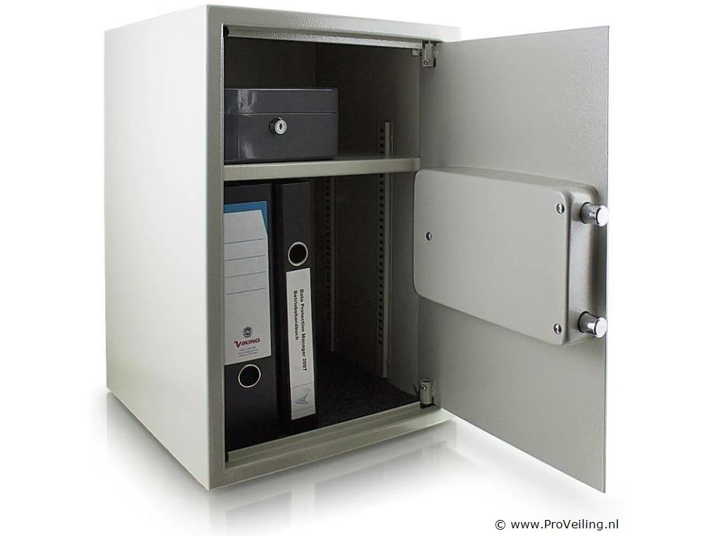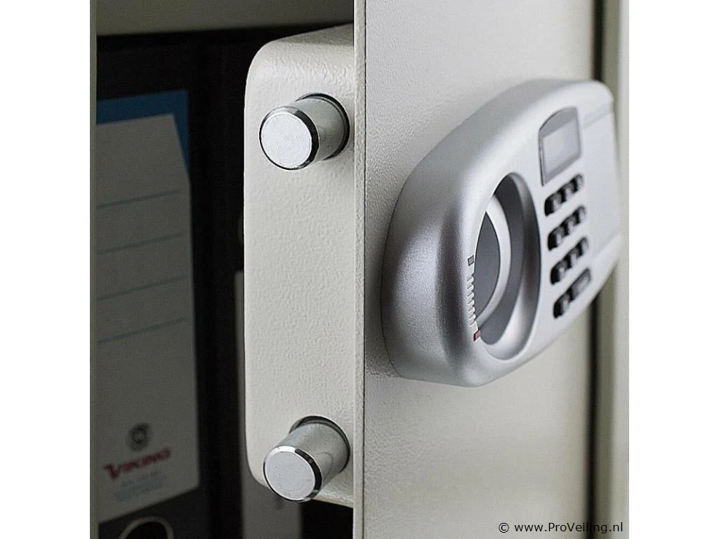 Het is ideaal voor het opbergen van dossiers, kostbaarheden of belangrijke documenten. Kies tussen veilige wand- of kastmontage. De plank is uitneembaar en in hoogte verstelbaar. De kluis kan alleen worden geopend door het invoeren van uw persoonlijke pincode of met de meegeleverde beveiligingssleutel. De deur met dubbel grendelslot beveiligt de kluis tegen onbevoegd openen. Veilige opslag, elektronische kluis voor wand- of kastmontage. Inrichting: Programmeerbare elektr. combinatieslot dubbele boutvergrendeling Uitneembaar en in hoogte verstelbaar inlegvel Wand- en kastmontage Technische data: Buitenafmetingen 35 x 52 x 36 cm Binnenmaat 34,5 x 51,5 30 cm Stalen wanddikte 2 mm Stalen deurdikte 4 mm Gewicht 20kg Kleur lichtgrijs Leveringsomvang: 1x kluis met elektr. combinatieslot 2x beveiligingssleutels 2x bevestigingsbouten 1x gebruiksaanwijzing