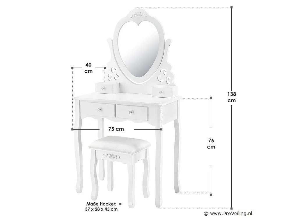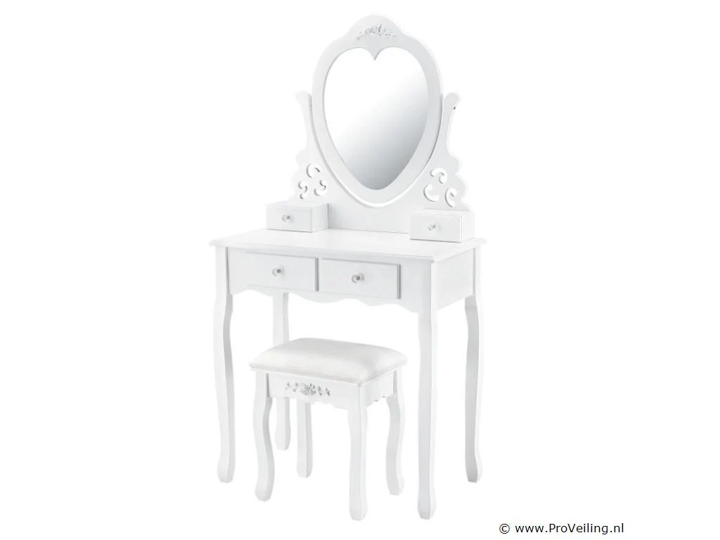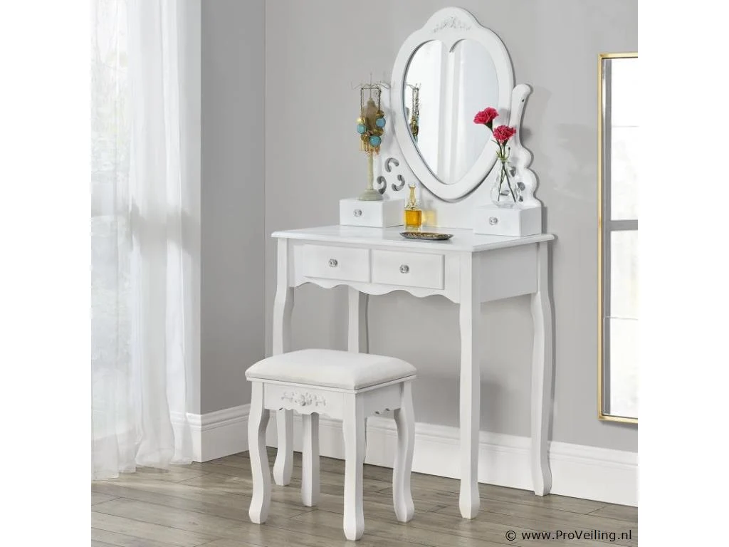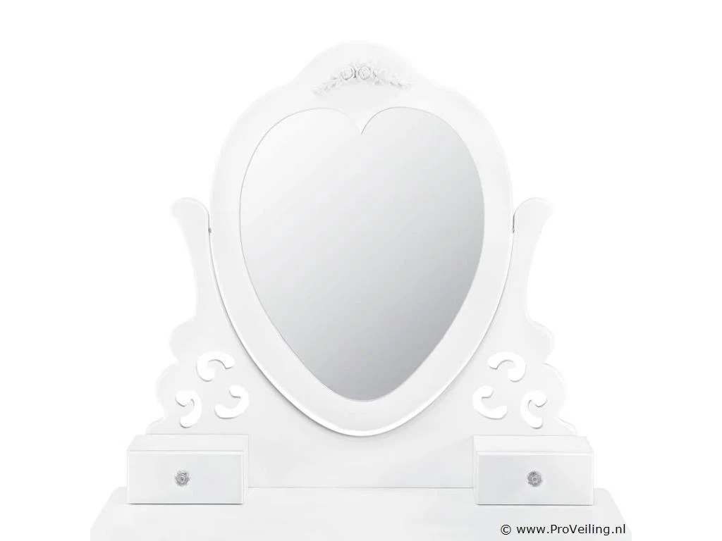 De make-up tafel Julia wit met spiegel, krukje en 4 lades is de absolute musthave voor beauty queens. Ontwerp een comfortabele cosmetica- en kappershoek in de slaapkamer, tienerkamer of kinderkamer. De kaptafel is gemaakt van wit gelakt MDF-hout en maakt indruk met zijn romantische, speelse landelijke uitstraling. De hartvormige spiegel en het krukje met bloemenbekleding zorgen voor veel comfort bij dagelijkse make-up en kappersbeurt. Vier lades met decoratieve handgrepen bieden ruimte voor cosmetica, parfum, sieraden en allerlei accessoires. Technische specificaties: Kaptafel: 100% MDF-hout Kruk: 40% katoen, 60% polyester Kleur wit Ontwerp: landelijke stijl Aantal spiegels: 1 Aantal lades: 4 Maximale belasting kruk: 100 kg Afmetingen (ongeveer): Totale afmetingen: 74 x 40 x 138 cm (BxDxH) Hoogte tafel: 76 cm Hoogte spiegelbevestiging: 62 cm Kruk: 37 x 28 x 45 cm Leveringsomvang: 1 × kaptafel 1 × kruk 1 × montage-instructies