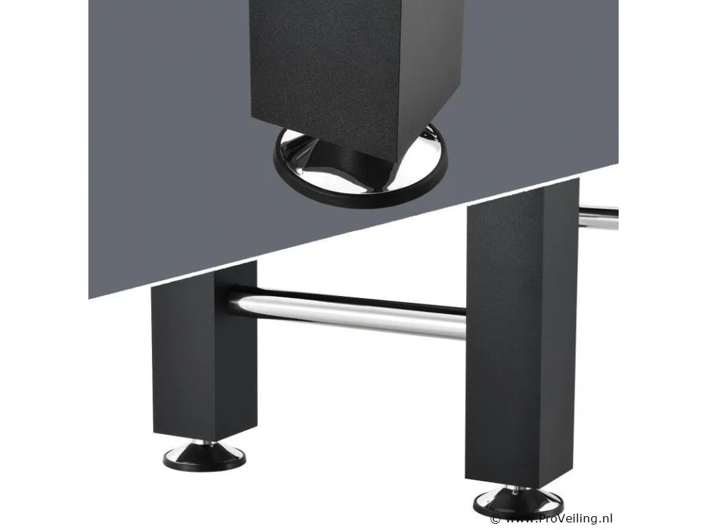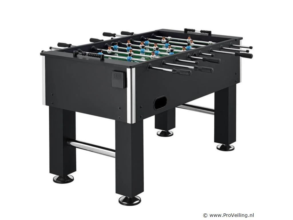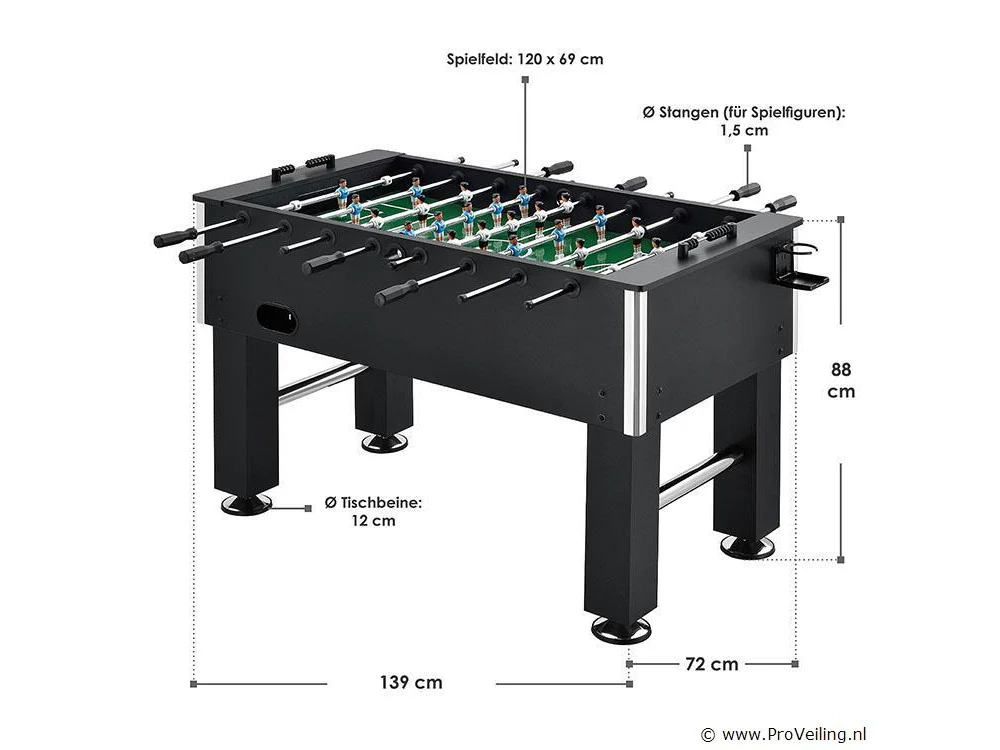Technische specificaties: Kleur: zwart Materiaal: MDF-hout, kunststof Voeten: in hoogte verstelbaar Afmetingen (ongeveer): Lengte: 139 cm Breedte: 72 cm Hoogte: 88 cm Speelveld: 120 x 69 cm Ø tafelpoten: 12 cm Ø staven (voor speelfiguren): 1,5 cm