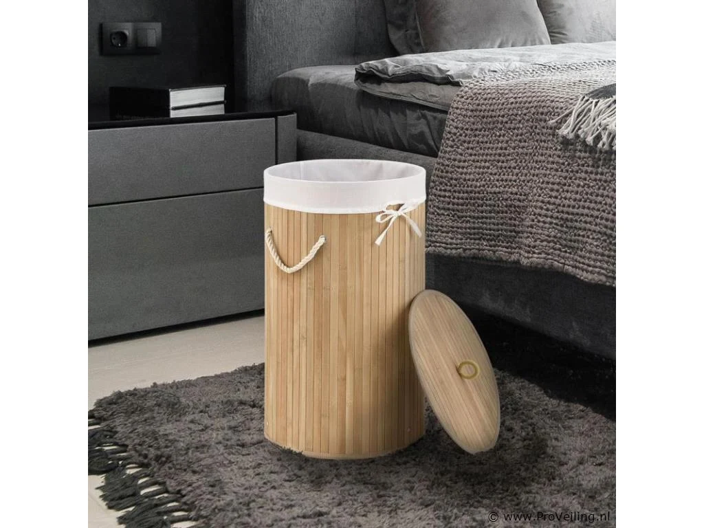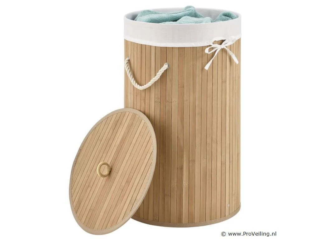 Berg vuile was netjes en afgesloten op De ronde bamboe wasmand Curly-Round (55 liter, naturel) met deksel en waszak wordt gebruikt om je wasgoed netjes in op te bergen. Bewaar ruim 50 liter vuile was voor een 2-persoonshuishouden. Voor meer orde plaats je de mand (Ø 35 cm, smal) in de slaapkamer of naast het bad in de badkamer. Voor hygiënische opslag kan de mand worden afgesloten met een houten deksel. Zo blijven nare luchtjes weg! Bij de wasbox hoort ook een uitneembare waszak (polyester). Zodat je de wasmand flexibel naar de wasmachine kunt dragen, is de wasbox licht van gewicht en voorzien van twee draagbeugels. Technische specificaties: Inhoud: 55 liter Materiaal body: bamboe, metaal Lichaamskleur & -vorm: Natuurlijk, rond Materiaal waszak: 100% polyester Kleur waszak: wit Handgrepen: 2 x koorden Plaats van gebruik: Droge binnenruimte Afmetingen (ongeveer): Hoogte: 60cm Diameter: 35cm Leveringsomvang: 1 x wasmand 1 x waszak 1 * Instructie