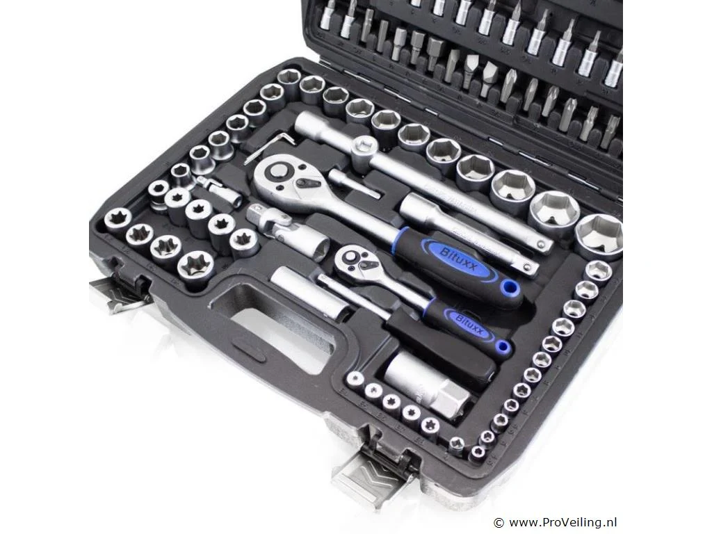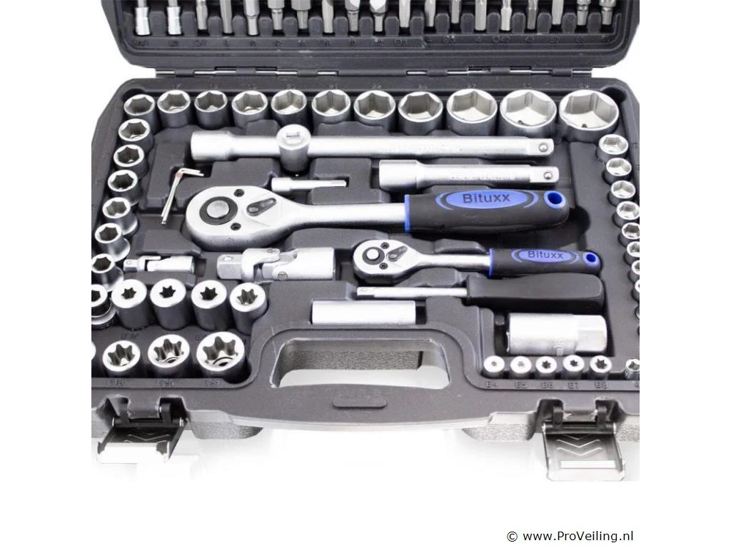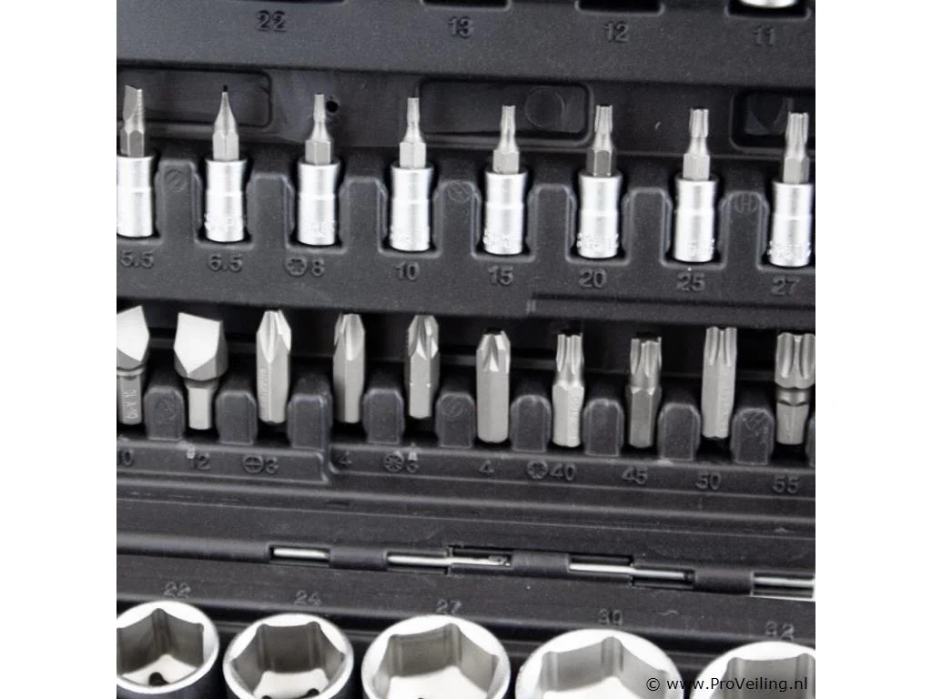 Deze 108-delige dopsleutelset overtuigt door kwaliteit en omvang. De ideale set voor de ambitieuze doe-het-zelver, praktisch en overzichtelijk, veilig opgeborgen in de koffer. Het gereedschap is gemaakt van chroom-vanadium-staal, het vanadium zorgt voor een verhoogde taaiheid met een fijnere structuur en het chroomgehalte verbetert de corrosiebescherming en hardbaarheid. Technische specificaties: Materiaal kast: kunststof Gereedschapsmateriaal: chroom-vanadiumstaal Leveringsomvang: 17x 1/2" doppen: 10, 11, 12, 13, 14, 15, 16, 17, 18, 19. 20, 21, 22, 24, 27, 30 32 mm 8x 1/2" Torx doppen: EI0, ??11, 12, 14, 16, 18, 20, 24mm 5x 1/2" extra diepe doppen: 14, 15, 17, 19, 22 mm 2x 1/2" bougiedoppen: 16 mm & 21 mm 2x 1/2" verlengstangen: 5" & 10" 18x 1/4" doppen: SL4, 5.5, 6.5, PH, 2 PZ1, 2e HEX3, 4, 5, 6, T8, 10, 15, 20, 25, 27, 30 13x 1/4" doppen: 4, 4,5, 5, 5,5, 6, 7, 8, 9, 10, 11, 12, 13, 14 mm 8x 1/4" extra diepe doppen: 6, 7, 8, 9, 10, 11, 12, 13mm 5x 1/4" Torx doppen: E4, 5, 6, 7, 8 2x 1/4" verlengstukken: 2" & 4" 1x 1/4" T-greep 1x 1/4" insteekgreep 6" 2x ratel: 1/4" & 1/2" 2x cardangewrichten: 1/4" & 1/2" 1x driedubbele adapter 17x bits SL8, 10, 12 T40, 45, 50, 55, 60 PH3, 4 Pz3, 4 HEX7, 8, 10, 12, 14 3x inbussleutels: 1,5, 2, 2,5 mm 1x bithouder 1x kunststof koffer