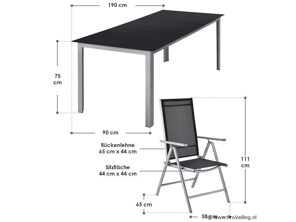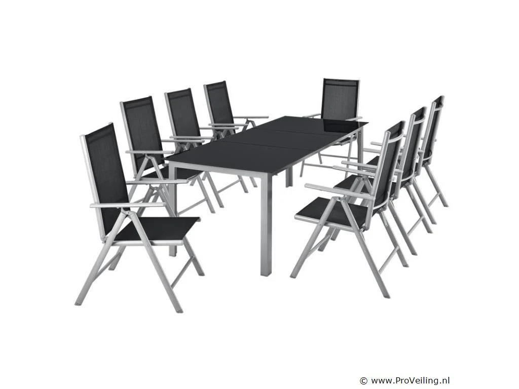 De 9-delige aluminium tuinset Milano met een grote tafel en acht stoelen is een perfecte zomerse metgezel voor frisse lucht kenners. Breng spelavonden, brunch- en koffiekransen, kleurrijke kinderverjaardagsfeestjes en grote barbecuefeesten door bij je nieuwe eetgezelschap. De montage is snel gedaan en de lichte tuinmeubelen zijn in een mum van tijd mee te nemen. De supergemakkelijke reiniging en verzorging duurt niet lang na elk feest. Vouw je stoelen in één keer op en alle sporen zijn verdwenen. Technische specificaties: Materiaal frame: gepoedercoat aluminium Materiaal gaas: textielstof Materiaal tafelbladen: 5 mm veiligheidsglas Kleur montuur: zilvergrijs Vlechtkleur: zwart Afmetingen (ongeveer): Afmetingen tafel: 190 x 90 x 75 cm Afmeting stoel: 52 x 65 x 110 cm Zitting: 44 x 44 cm Ruggedeelte: 65 x 44 cm Leveringsomvang: 1 × tafel 8 × stoel 3 × glasplaat 1 × montage-instructies