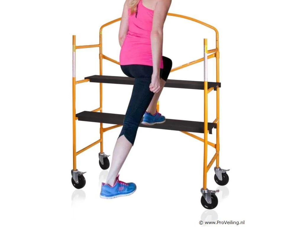 Toepassingsgebied voor professionals, ambachtslieden en doe-het-zelvers. Dit stabiele werkplatform kan ook gebruikt worden als schilderplatform, steiger of werkbank. Ook in kleine ruimtes kan het werkplatform optimaal worden ingezet, vooral voor interieurwerkzaamheden. Door simpelweg de antislip loopplaten naast elkaar te plaatsen, wordt het loopvlak verdubbeld en kan dus ook als werkbank gebruikt worden, bijvoorbeeld om met een hakzaag te werken. Het werkplatform kan in enkele eenvoudige stappen worden ingeklapt en is daardoor zeer gemakkelijk te vervoeren. De twee antislip-tredeplaten kunnen op 4 verschillende hoogtes worden ingesteld. 4 grote wielen zorgen voor een veilige stabiliteit dankzij hun vergrendelingsfunctie. Montageafmetingen: hoogte 1530 mm x diepte 535 mm x breedte 1100 mm. 4 grote stabiele wielen met rem. 2 antislip stalen platen. Stalen platen kunnen op 4 hoogtes geplaatst worden. Stalen platen op 300mm, 600mm 900mm 1200mm mogelijk. Laad 240 KG.