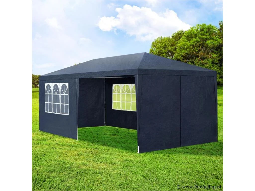 De partytent van 3 x 6 m (blauw) is de perfecte zonwering voor allerlei buitenevenementen Of het nu gaat om een ??barbecue, een verjaardag of een bruiloft - het praktische paviljoen nodigt uit om samen te zitten en feest te vieren met familie en vrienden. Onder de feesttent zijn u en uw gasten goed beschermd tegen de brandende zon. 's Avonds dienen de uitneembare zijpanelen als extra bescherming tegen koele tocht en muggen. Optimale voorwaarden om speciale gelegenheden uitgebreid te vieren in eigen tuin of op het terras. Technische specificaties: Materiaal frame: staal, gepoedercoat (100%) Materiaal dak: 100 g/m² polyethyleen (100%) Materiaal zijdelen: 90 g/m² polyethyleen (100%) Kleur tuintent: blauw Zijwand met raam: 4 Zijpaneel met ritssluiting: 2 Aantal voeten: 6 Aantal bevestigingstouwen: 6 Aantal grondpennen: 12 Afmetingen (ongeveer): Breedte: 300cm Diepte: 600 cm Hoogte: 250cm Paaldak: Ø 1,8 cm Plaatbodem: Ø 2,4 cm Leveringsomvang: 1 × feesttent 1 × montage-instructies tips: LET OP: Het tuinpaviljoen biedt onvoldoende bescherming bij storm of slecht weer. Niet gebruiken tijdens onweer, sterke windstoten, zware regenval of hagel. Het paviljoen is niet ontworpen voor dit weertype. Alleen geschikt voor privégebruik. Zet de partytent veilig op een vlakke, droge en stevige ondergrond. Houd de minimale afstand van 3 m tot de volgende tent aan. Het is niet mogelijk om 2 tenten aan elkaar te koppelen.