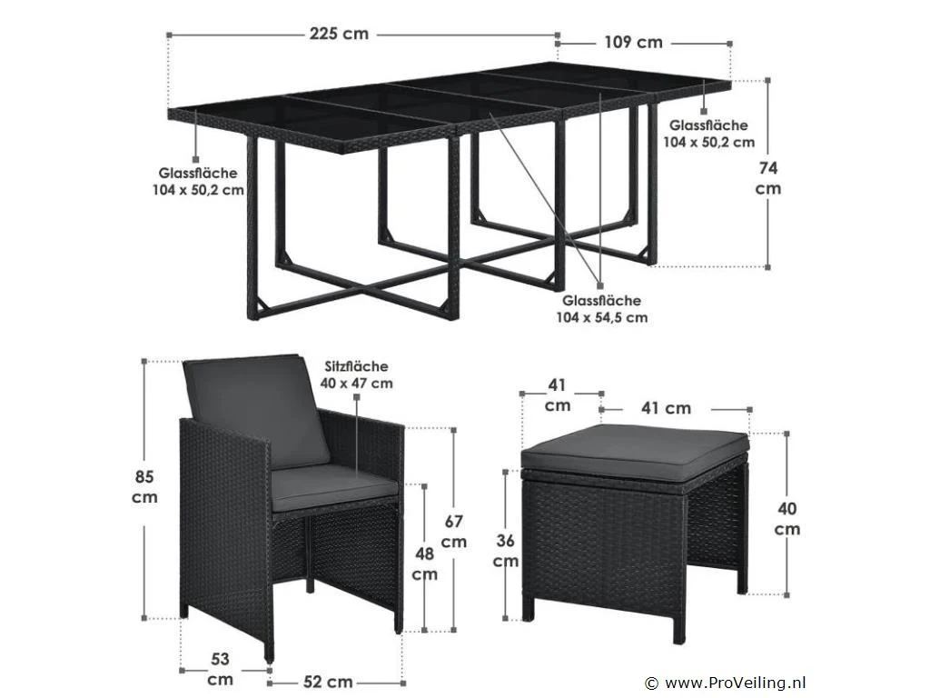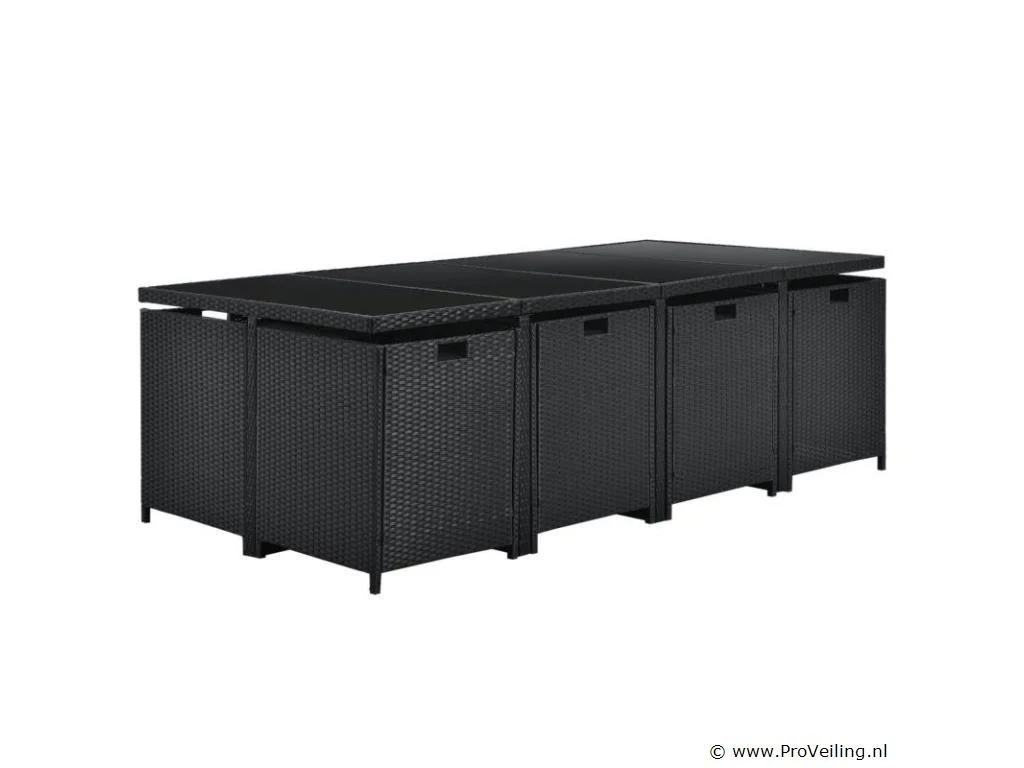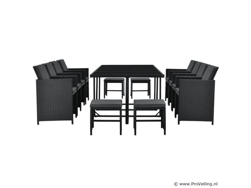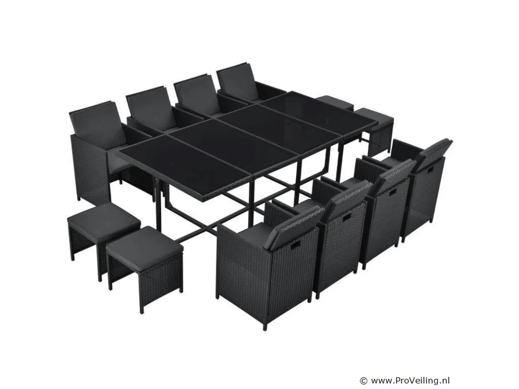 Lange, warme zomeravonden bieden de perfecte gelegenheid voor een samenzijn met vrienden of familie. Onze grote 13-delige tuinset biedt plaats aan maximaal 12 personen en overtuigt tegelijkertijd door zijn verbazingwekkend ruimtebesparende opbergtechniek als kubus. De grote polyrotan zitgroep in effen zwart en grijs ziet er modern uit en past perfect in je tuin of op je terras. De buitenzitgroep kan optimaal worden gebruikt als eettafel en als lounge om te ontspannen. Technische specificaties: Materiaal kussen: foam, stof Materiaal gaas: polyrotan Materiaal onderstel: staal Materiaal tafelblad: glas Aantal personen: 12 Kleur polyrotan: zwart Kleur stof: donkergrijs Kleur glas: zwart getint Kussenslopen: afneembaar & wasbaar Afmetingen (ongeveer): Afmetingen tafelblad: 225 x 109 cm Tafelhoogte: 74 cm Zitkruk: 41 x 41 cm Zithoogte kruk (met kussen): 40 cm Zithoogte kruk (zonder kussen): 36 cm Zitting stoel: 40 x 47 cm Zithoogte stoel (met kussen): 48 cm Zithoogte stoel (zonder kussen): 44 cm Rugleuning stoel: 40 cm Dikte zitkussen: 4 cm Leveringsomvang: 1x tafel 8 x stoelen 4 x krukken 12 x zitkussens 8 x rugkussens 1 x Instructie