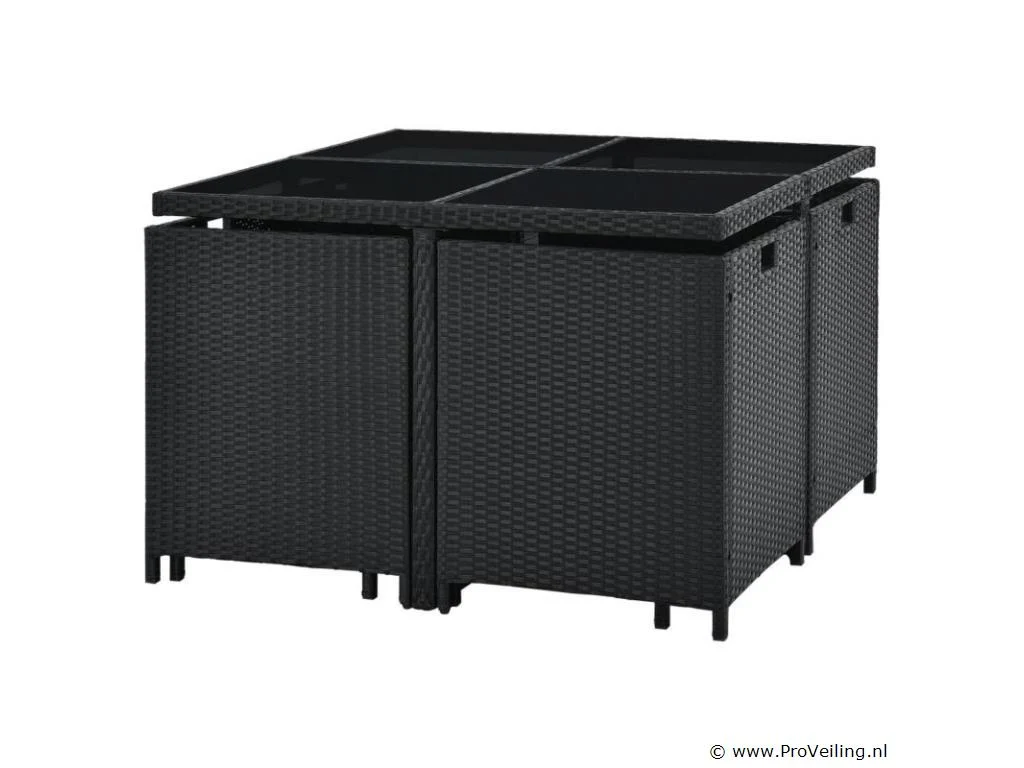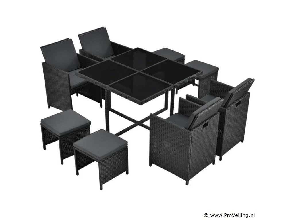 Lange, warme zomeravonden bieden de perfecte gelegenheid voor een samenzijn met vrienden of familie. Onze grote 9-delige tuinset biedt plaats aan maximaal 8 personen en overtuigt tegelijkertijd door zijn verbazingwekkend ruimtebesparende opbergtechniek als kubus. De grote polyrotan zitgroep in effen zwart en grijs ziet er modern uit en past perfect in je tuin of op je terras. De buitenzitgroep kan optimaal worden gebruikt als eettafel en als lounge om te ontspannen. Technische specificaties: Materiaal kussen: foam, stof Materiaal gaas: polyrotan Materiaal onderstel: staal Materiaal tafelblad: glas Aantal personen: 8 Kleur polyrotan: zwart Kleur stof: donkergrijs Kleur glas: zwart getint Kussenslopen: afneembaar & wasbaar Afmetingen (ongeveer): Afmetingen tafelblad: 109 x 109 cm Tafelhoogte: 74 cm Zitkruk: 41 x 41 cm Zithoogte kruk (met kussen): 40 cm Zithoogte kruk (zonder kussen): 36 cm Zitting stoel: 40 x 47 cm Zithoogte stoel (met kussen): 48 cm Zithoogte stoel (zonder kussen): 44 cm Rugleuning stoel: 40 cm Dikte zitkussen: 4 cm Leveringsomvang: 1x tafel 4 x stoelen 4 x krukken 8 x zitkussens 4 x rugkussens 1 x Instructie