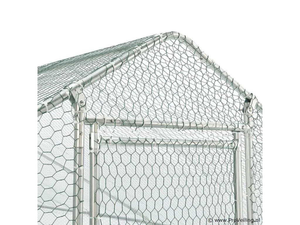 Ben je zelfvoorzienend of heb je een uitlaatklep nodig voor de trend “houd de kippen in de tuin”? Het buitenverblijf HLS25T van 3x4x2 m is perfect voor het soortspecifiek buiten houden van dieren. In de gegalvaniseerde box voor kippen, konijnen en ganzen hebben kleine dieren buiten genoeg ruimte op 12 m². Planten zijn hier ook beschermd en droog. Je bevestigt het waterdichte zeildoek flexibel aan het frame. Door de gegalvaniseerde buizen en het PVC-gecoate hek heb je een stabiel en duurzaam kippenhok dat je eenvoudig in elkaar zet door middel van het plug-and-click systeem. Technische specificaties: Materiaal draad: galvanisch verzinkt ijzer, PVC gecoat, zeshoekig (vorm) Materiaal palen: gegalvaniseerd ijzer Materiaal dekzeil: PE (waterdicht, regenbescherming), materiaal accessoires: kunststof Boxkleur: zilver, grijs (frame), wit (zeildoek), groen (net) Geschikt voor: kleine dieren zoals kippen, konijnen, ganzen, eenden & planten (bijv. gewassen, bloemen) Bijzonderheden: Toegankelijk via hoge deur, met poortgrendel, zeildoek Boxvorm: Vierkant Plaats van gebruik: buiten Afmetingen (ongeveer): Totale afmetingen van de volière: 300 x 400 x 200 cm (BxLxH), 385 cm (exacte lengte) Buitenruimte: 12 m² Hoogte dak: 115 - 200 cm Deur: 55 x 158 cm (BxH) Buisdiameter: 2,5 cm, dikte: 1 mm Rasterhek: 3 x 4 cm (BxH), dikte: 0,5 mm Dekzeil: 340 x 195 cm (BxH) Rol kippennet: 1 x 36m Leveringsomvang: 1 x Ren 1 x rol kippenhek 1 x dakzeil 1 x deur met vergrendeling 1 x Instructie Let op: Alleen geschikt voor kleine dieren zoals kippen, konijnen, ganzen, eenden & planten. Vraag: Kan ik meerdere producten aan elkaar koppelen? Nee. Kan de deur rechts of links worden geopend? We raden aan om ze links te monteren, rechts kan ook. De box is afsluitbaar met een grendel. Er is geen slot met sleutel, het wordt met de hand geopend en gesloten. Het PE dekzeil (waterdicht) heeft geen zonwerende functie, maar dient als regenwering. Je bevestigt het dekzeil flexibel aan de palen door middel van de elastische banden.