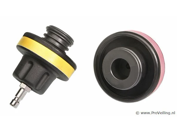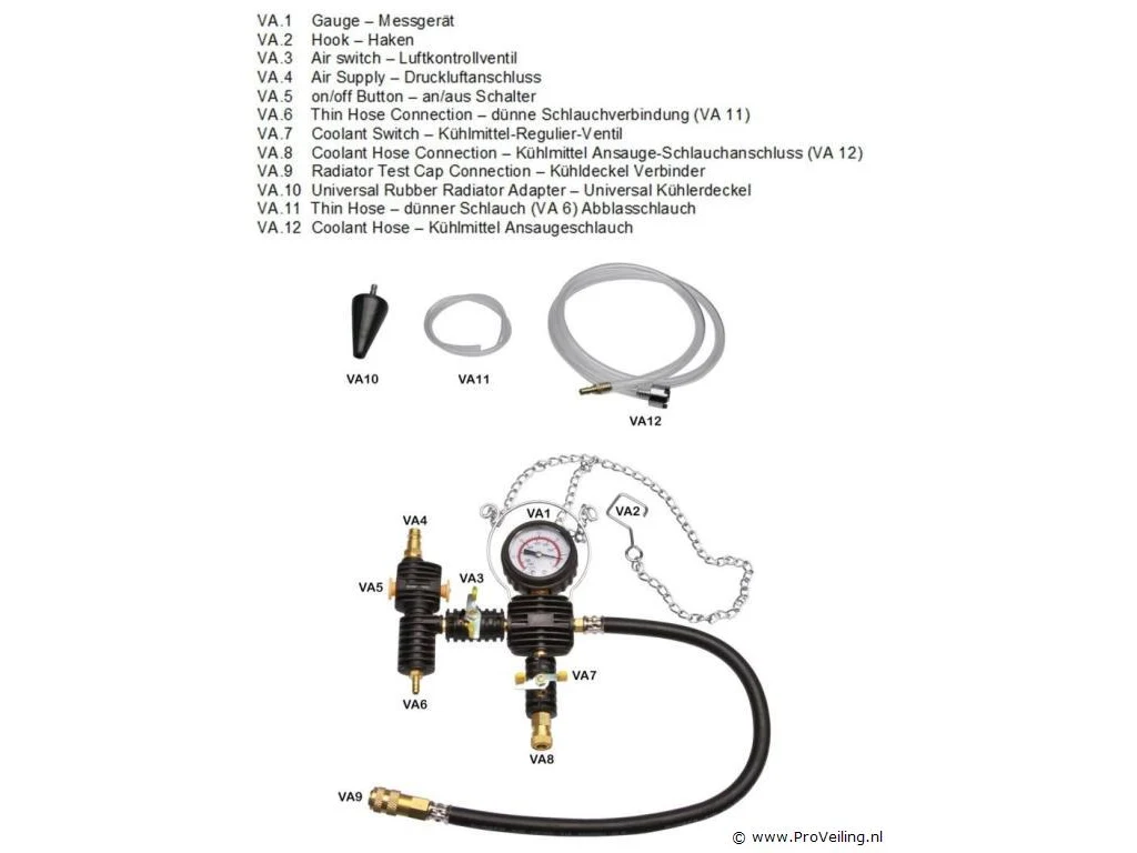 28-delige koelsysteemtester Radiatordruktester Set met gebruikslijst in kunststof koffer Door druk op te bouwen met de handpomp, Koelsystemen van een breed scala aan voertuigtypen kunnen worden getest. Compleet met diverse adapters, zie foto voor de verschillende items. Specificatie van de vacuümkoelsysteem KIT: 1. Manometer 2. Haak 3. Persluchtschakelaar 4. Persluchttoevoer 5. Aan/uit-knop 6. Dunne slangaansluiting (afvoerlucht) 7. Koelvloeistofschakelaar 8. Koelvloeistofslang, aansluiting voor slang #12 9. Koelertest - aansluiting deksel 10. Universele rubberen radiateuradapter 11. dunne slang voor afvoerlucht 12. Koelvloeistofslang voor het bijvullen van koelvloeistof