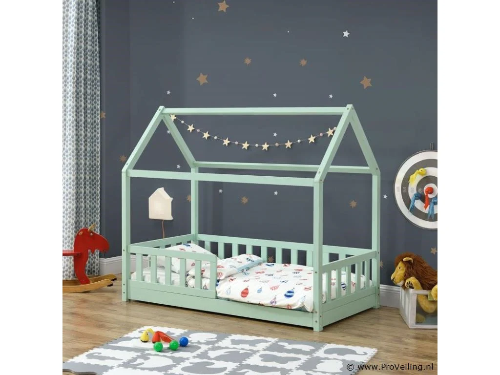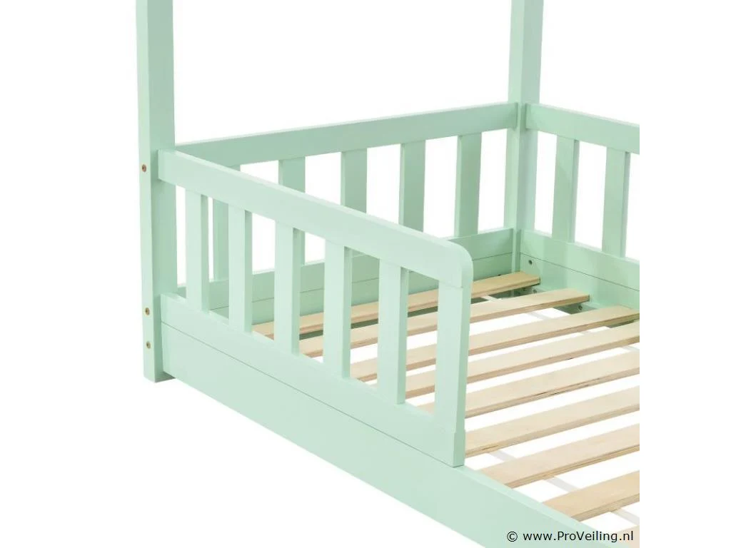 Het moderne kinderbed Marli (160x80 cm, mint) met valbeveiliging, lattenbodem en dak is ideaal voor meisjes en jongens van 3 tot 10 jaar. Als gezellige slaap- en speelplek verfraait het huisbed elke kinderkamer. Want de woninglook met open dak biedt veel mogelijkheden! Ontwerp het bed met baldakijndecoratie, als hol of avontuurlijk speelbed. Zeker voor jonge kinderen biedt een poortje meer bescherming en veiligheid. Het houten bed is de juiste keuze voor langdurig gebruik dankzij het stevige en onderhoudsvriendelijke grenenhout. Technische specificaties: Materiaal frame: grenen hout Materiaal lattenbodem: hout, 11 latten Kleur: mint Afmeting: 80x160cm Maximale belasting: 120 kg Matras: zonder Afmetingen (ongeveer): Totale afmetingen (BxLxH): 87 x 166 x 143 cm Ligoppervlak: 160x80 cm Leveringsomvang: 1 × kinderbed 1 × lattenbodem 1 × dak 1 × Montage-instructies