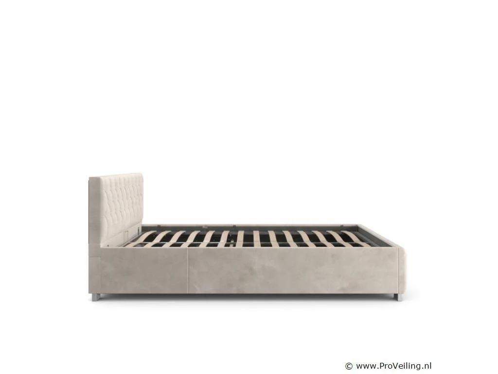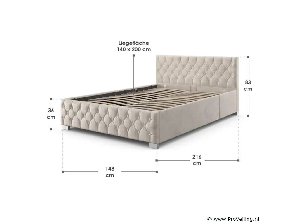 Het gestoffeerde bed Nizza combineert stijlvol Chesterfield-stikwerk met moderne, indirecte ledverlichting. Dankzij de zachte vulling met fluwelen hoes dient het hoge hoofdeinde als comfortabele rugleuning. De verende lattenbodem en de grote bedstee maken het comfortabele slaapkamermeubilair compleet. Technische specificaties: Materiaal lijst: MDF-hout Materiaal bekleding: fluweel Kleur hoes: beige Kleur voetjes: zilver Lichtkleur: wit Draagvermogen: 250 kg Afmetingen (ongeveer): Afmetingen: 148x216 cm Hoogte hoofdeinde: 83 cm Hoogte bedframe: 36 cm Hoogte voeten: 6 cm Ligoppervlak: 140x200 cm Leveringsomvang: 1 × gestoffeerd bed 1 × lattenbodem 1 × Instructie