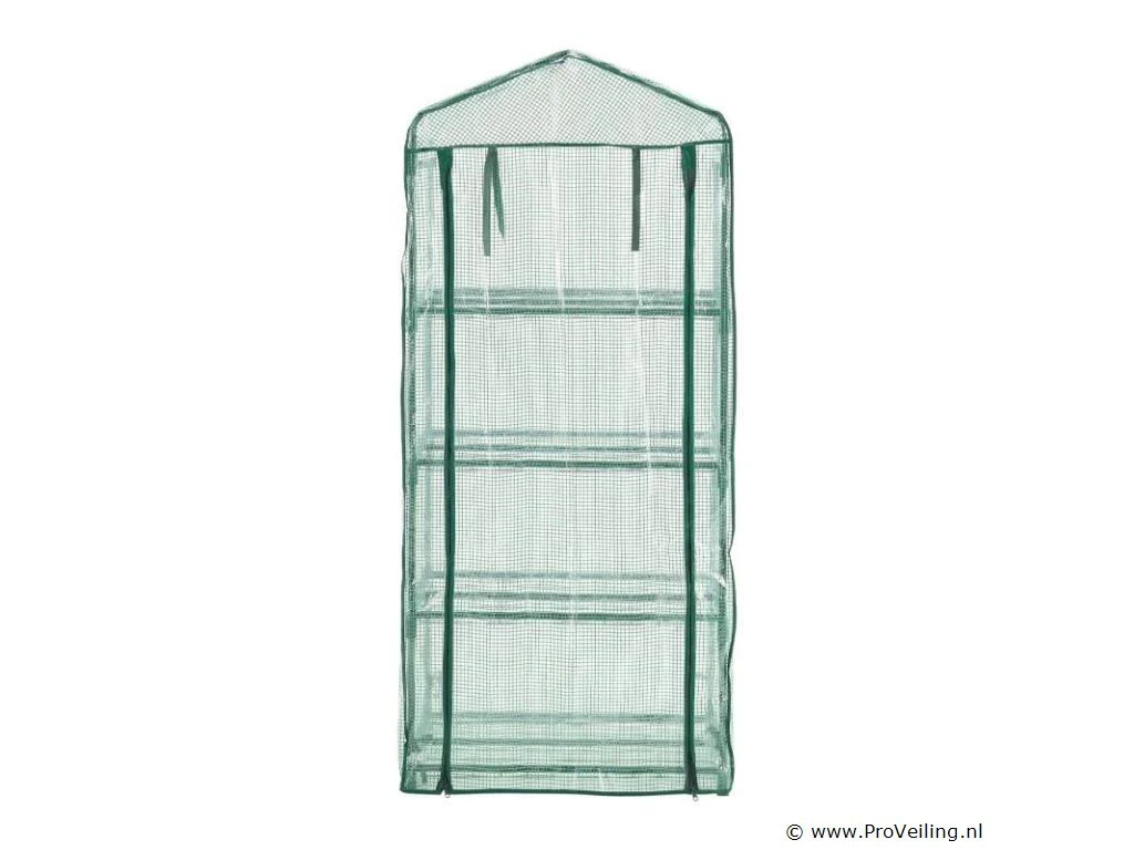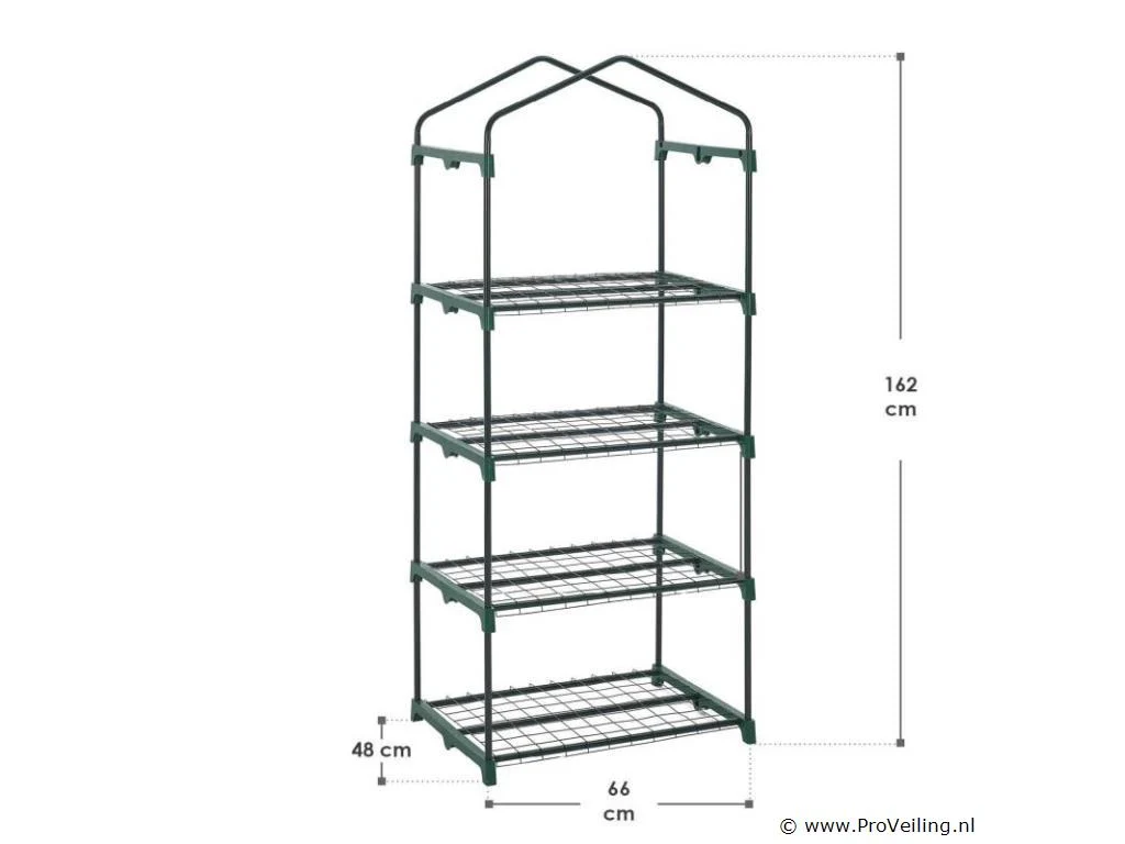 De foliekas 66x162x48 cm met PE-afdekking is bijzonder compact en licht, ideaal voor het kweken van groenten en fruit of voor het overwinteren van kleine planten. De robuuste beschermfolie van polyethyleen houdt ongedierte en negatieve weersinvloeden betrouwbaar buiten de deur. Tegelijkertijd laat het de ongehinderde penetratie van zonnestralen toe om een ??ideaal microklimaat te creëren voor de groei van de planten. Dankzij de kleine voetafdruk is de broeikas speciaal ontworpen voor op het balkon of terras. Het eenvoudige steeksysteem maakt een snelle en ongecompliceerde montage mogelijk. Technische specificaties: Materiaal frame: metaal (gepoedercoat), polypropyleen Materiaal folie: polyethyleen Kleur: helder, groen Draagvermogen: 40 kg per niveau Afmetingen (ongeveer): Afmeting (BxHxD): 66x162x48 cm Buizen: Ø 1,6 cm Leveringsomvang: 1 × broeikas 1 × afdekfolie 1 × montage-instructies