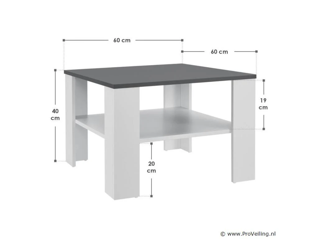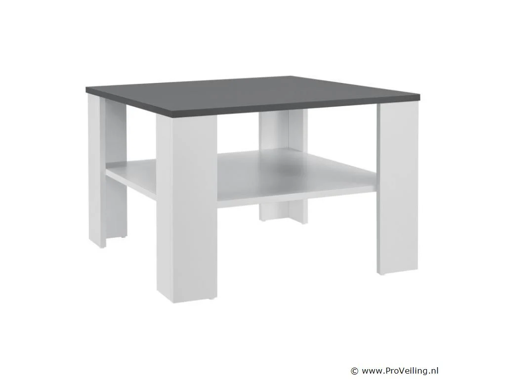 Met zijn compacte design en de eenvoudige, rechtlijnige look past de tafel in wit en donkergrijs perfect in bijna elke sfeer. De afmetingen van slechts 60 x 60 cm maken hem ideaal voor kleine ruimtes of als discrete bijzettafel. Op zijn 2 niveaus biedt hij verrassend veel ruimte voor drankjes, snacks, tijdschriften of afstandsbedieningen. De woonkamertafel is gemaakt van hout, wat hem niet alleen veerkrachtig en robuust maakt, maar ook licht van gewicht. Dankzij de melaminecoating zijn de oppervlakken ongevoelig voor krassen en zeer onderhoudsvriendelijk. Technische specificaties: Materiaal: spaanplaat E1 (melamine gecoat) Kleur: wit/donkergrijs Afwerking: Mat Maximale belasting: 50 kg Afmetingen (ongeveer): Totale afmetingen (LxBxH): 60x60x40 cm Afmeting vak: 57x57 cm Hoogte vak: 19 cm Materiaaldikte: 15 mm Bodemvrijheid: 20 cm Leveringsomvang: 1 × tafel 1 × montage-instructies