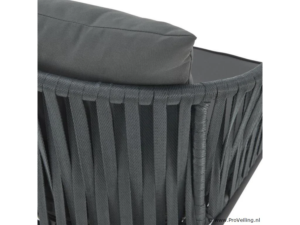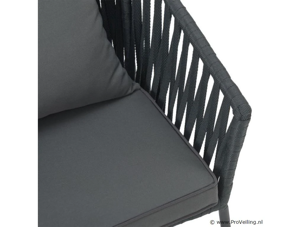Stijlvol en elegant, met de 2 Rope stoelen zet u een bijzonder hoogtepunt op uw terras of balkon. Het touwgaas en de dikke bekleding zorgen voor een bijzonder zitcomfort. De constructie is uiterst robuust en dankzij de poedercoating corrosie- en krasbestendig. Technische specificaties: Materiaal frame: staal (gepoedercoat) Materiaal gaas: polypropyleen Materiaal bekleding: 100% polyester Kleur frame: zwart Vlechtkleur: donkergrijs Kleur bekleding: donkergrijs Maximale belasting: 160 kg Afmetingen (ongeveer): Totale afmetingen (LxBxH): 58x58x78 cm Zithoogte: 48 cm Dikte zitkussen: 5 cm Dikte rugkussen 12 cm Leveringsomvang: 2 x stoel 2 x zitkussens 2 x rugkussens 1 × montage-instructies