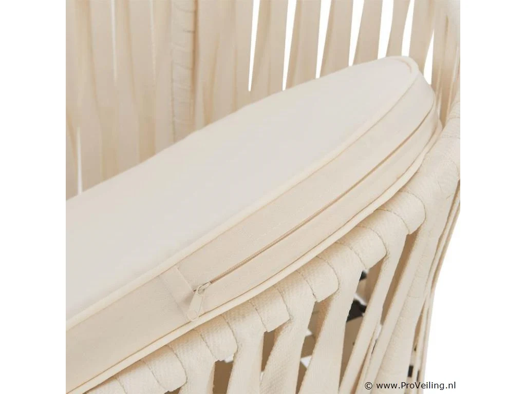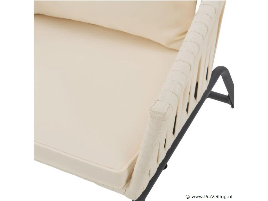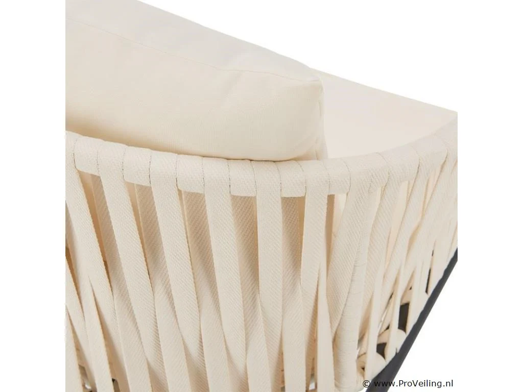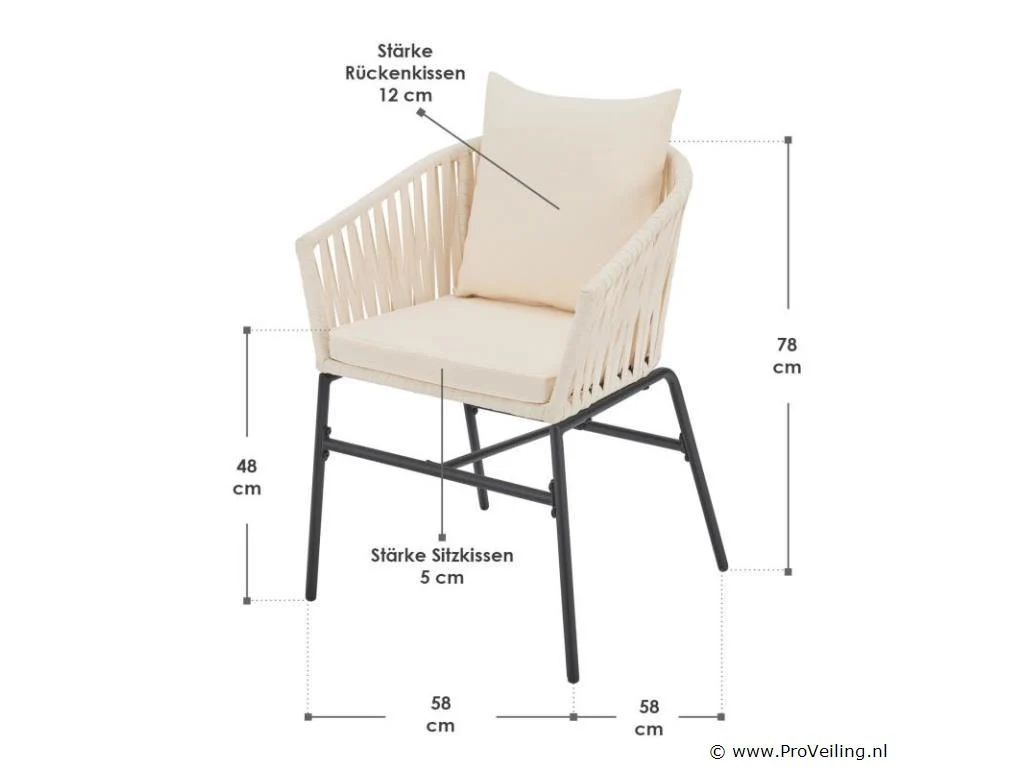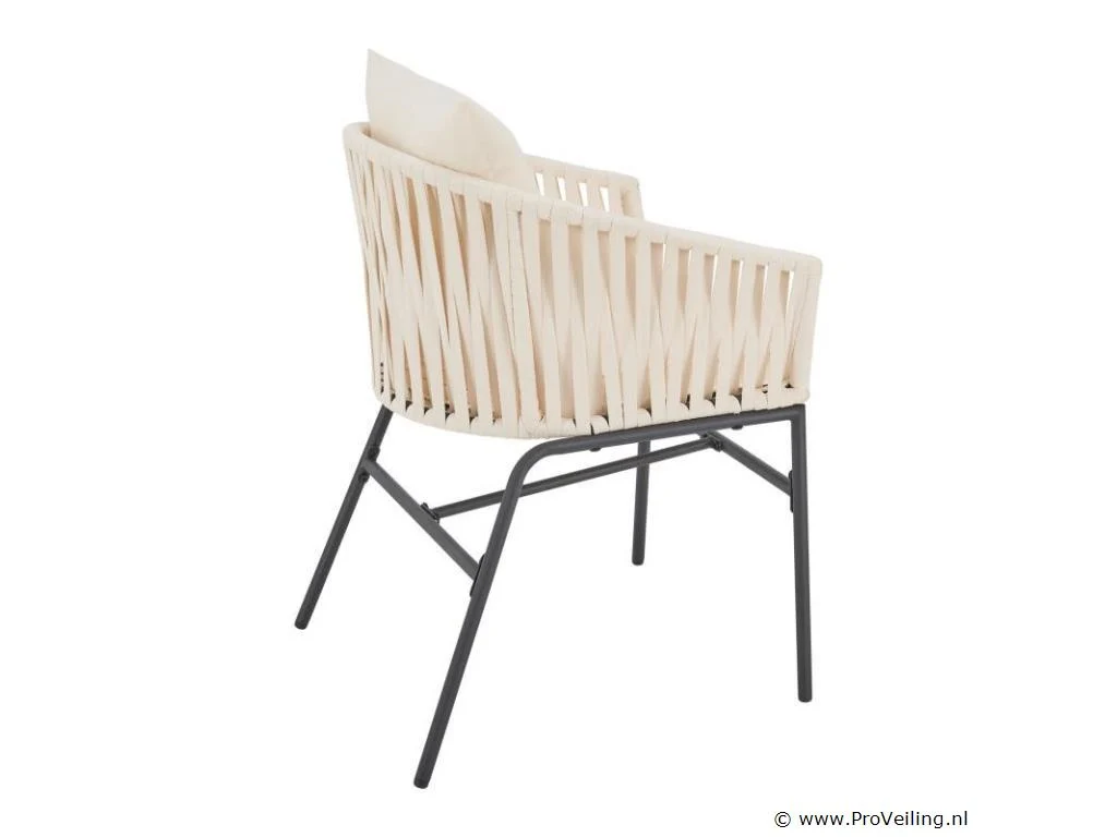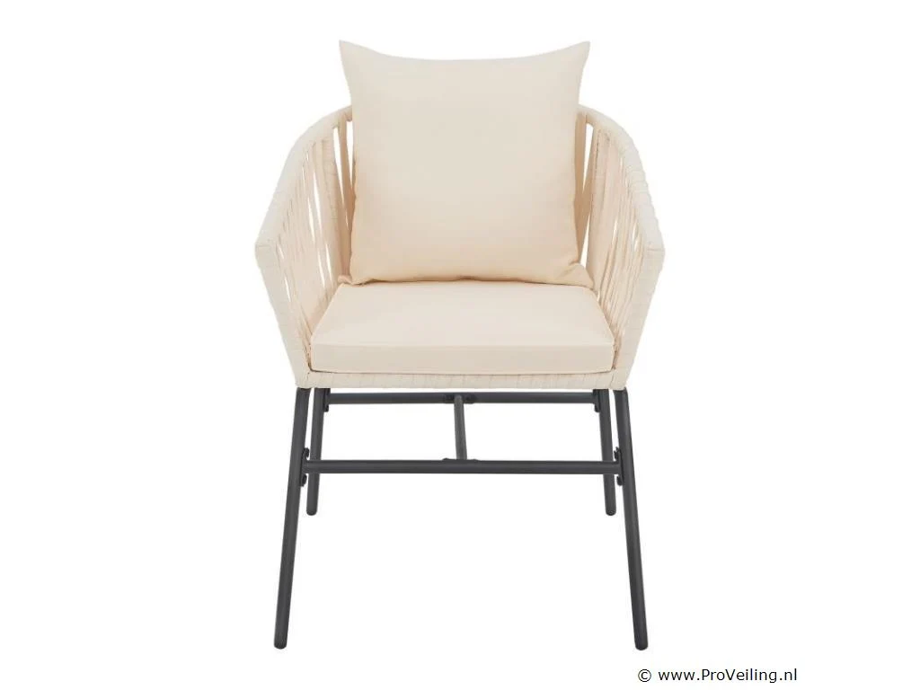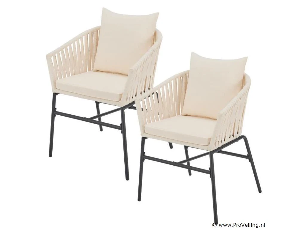 Stijlvol en elegant, met de 2 Rope stoelen zet u een bijzonder hoogtepunt op uw terras of balkon. Het touwgaas en de dikke bekleding zorgen voor een bijzonder zitcomfort. De constructie is uiterst robuust en dankzij de poedercoating corrosie- en krasbestendig. Technische specificaties: Materiaal frame: staal (gepoedercoat) Materiaal gaas: polypropyleen Materiaal bekleding: 100% polyester Kleur frame: zwart Vlechtkleur: Beige Kleur bekleding: Beige Maximale belasting: 160 kg Afmetingen (ongeveer): Totale afmetingen (LxBxH): 58x58x78 cm Zithoogte: 48 cm Dikte zitkussen: 5 cm Dikte rugkussen 12 cm Leveringsomvang: 2 x stoel 2 x zitkussens 2 x rugkussens 1 × montage-instructies