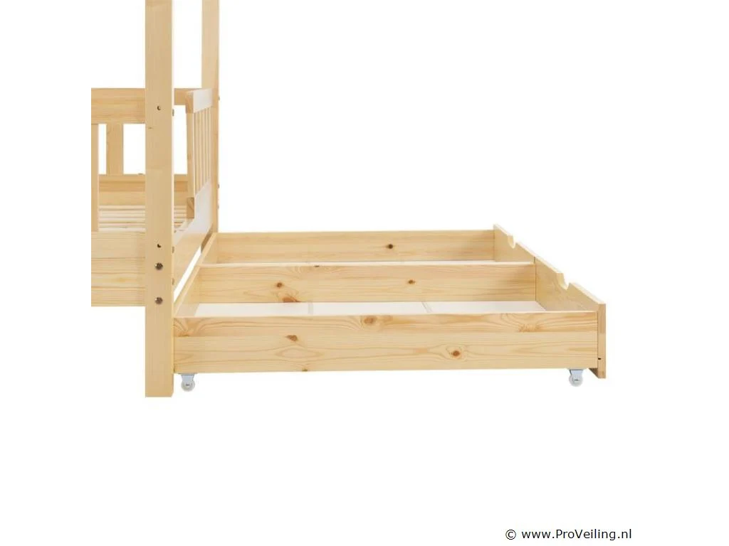 Het kinderbed Marli (160x80 cm, houtkleur) met bedstee, valbeveiliging en lattenbodem maakt indruk op meisjes en jongens van 3 tot 10 jaar. Verfraai de kinderkamer met het moderne huisbed, een slaapplek, speelbed en opbergruimte in één. Speelgoed kan netjes worden opgeborgen in de grote 2-delige bedbak. En de huislook met dak biedt vele vormgevingsmogelijkheden - als grot of met een betoverende luchtdecoratie. Uitgerust met een rail biedt het bed ook meer bescherming en veiligheid voor jonge kinderen. Het houten bed van massief en onderhoudsvriendelijk grenenhout is de juiste keuze voor langdurig gebruik. Technische specificaties: Materiaal lijst: grenenhout Materiaal lattenbodem: hout, 13 latten Kleur houtkleur Maximale belasting: 125 kg Maximale belasting per lade: 25 kg Aantal lades: 2 Matras: Geen Afmetingen (ongeveer): Totale afmetingen (BxLxH): 87x167x154 cm Ligvlak (BxL): 80x160 cm Bedstee (BxDxH): 78x84x14 cm Leveringsomvang: 1 x kinderbed 80x160 cm 1 x lattenbodem 1 x dak 2 x bedlade 1 x Instructie
