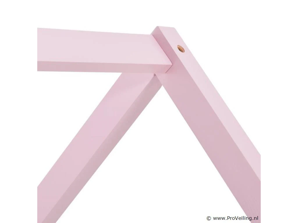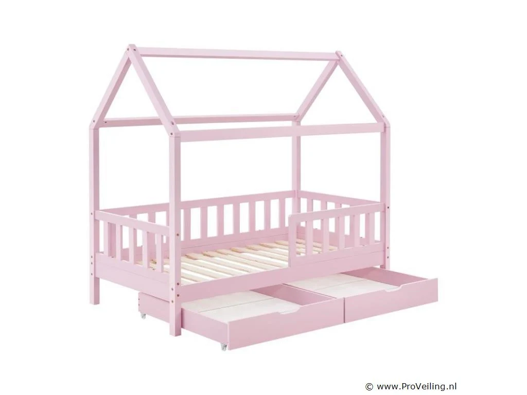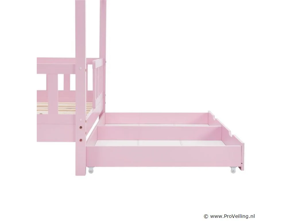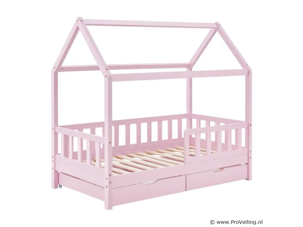 Het kinderbed Marli (160x80 cm, roze) met bedstee, valbeveiliging en lattenbodem maakt indruk op meisjes en jongens van 3 tot 10 jaar. Verfraai de kinderkamer met het moderne huisbed, een slaapplek, speelbed en opbergruimte in één. Speelgoed kan netjes worden opgeborgen in de grote 2-delige bedbak. En de huislook met dak biedt vele vormgevingsmogelijkheden - als grot of met een betoverende luchtdecoratie. Uitgerust met een rail biedt het bed ook meer bescherming en veiligheid voor jonge kinderen. Het houten bed van massief en onderhoudsvriendelijk grenenhout is de juiste keuze voor langdurig gebruik. Technische specificaties: Materiaal lijst: grenenhout Materiaal lattenbodem: hout, 13 latten Kleur: roze Maximale belasting: 125 kg Maximale belasting per lade: 25 kg Aantal lades: 2 Matras: Geen Afmetingen (ongeveer): Totale afmetingen (BxLxH): 87x167x154 cm Ligvlak (BxL): 80x160 cm Bedlade (BxDxH): 78x84x14 cm Leveringsomvang: 1 x kinderbed 80x160 cm 1 x lattenbodem 1 x dak 2 x bedlade 1 x Instructie