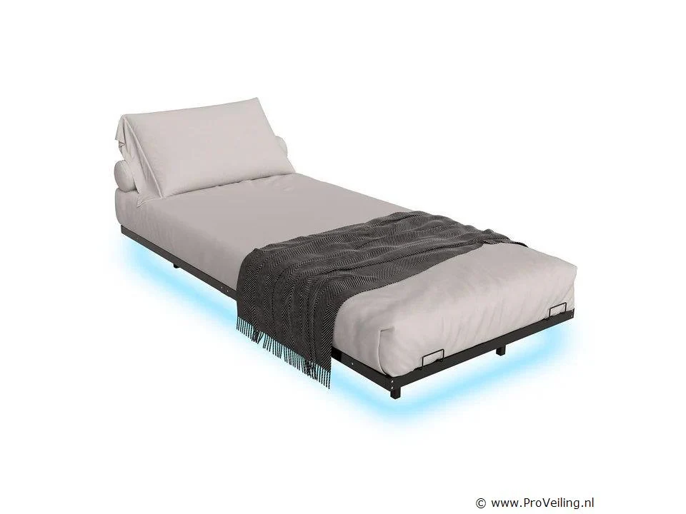 Het Palamos 90x200 cm metalen bed in de kleur zwart, zwevend en met LED-verlichting is perfect als u waarde hecht aan een unieke sfeer. Of het nu voor volwassenen of tieners is: het stijlvolle zwevende bed met lattenbodem maakt slapen tot iets heel bijzonders. Dankzij de robuuste constructie en sfeervolle verlichting combineert het eenpersoonsbed functionaliteit en stijl. Het ontwerp voegt een moderne toets toe aan elke kamer, terwijl de geïntegreerde lattenbodem zorgt voor optimaal slaapcomfort. Technische gegevens: Materiaal: metaal, gepoedercoat Kleur: Zwart Kleurtemperatuur: RGB (blauw, rood, groen, wit), dimbaar LED-verlichting: Voltage: 12 V | Vermogen: 24 W Maximaal. draagvermogen: 250 kg Toepassingsgebied: slaapkamer, logeerkamer, jeugdkamer Afmetingen (ongeveer): Afmetingen (BxLxH): 90x200x20 cm Let op: Matras is niet inbegrepen! Leveringsomvang: 1 x metalen bed 1 x lattenbodem 1 x bevestigingsmateriaal 1 x gebruiksaanwijzing Product Tags Bed