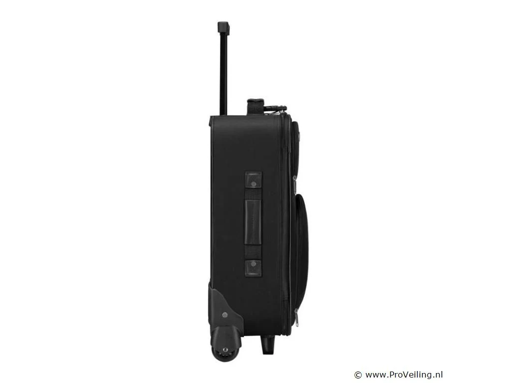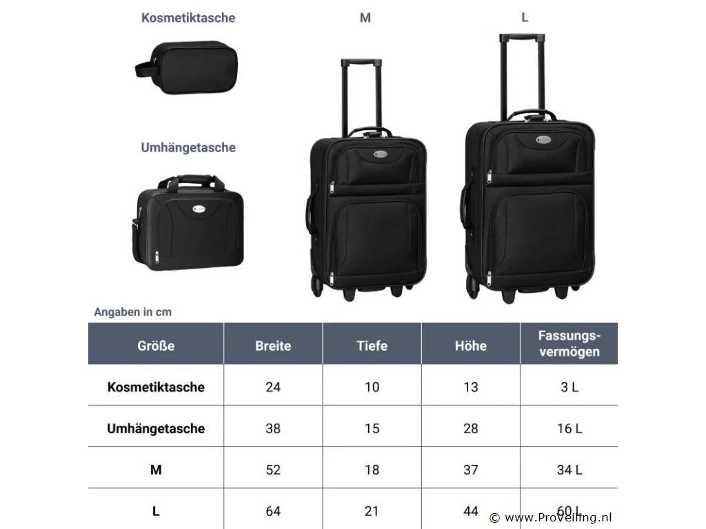 De 5-delige trolleykofferset Athens in de kleur zwart is de ideale basisuitrusting voor elke gelegenheid. Of het nu gaat om vakantie, stedentrip, weekendtrip of zakenreis, de set biedt de juiste koffer voor uw eisen. Naast 2 trolleys van verschillende afmetingen met lichtlopende wielen en aluminium telescopische stangen, bevat de set een praktische schoudertas voor handbagage en twee compacte en stijlvolle make-uptassen. De tassen en koffers zijn gemaakt van robuust polyester en hebben een waterafstotende coating. Voor meer veiligheid kunnen de hoofdvakken van de trolleys worden afgesloten (hangslot niet inbegrepen). Als je de set niet gebruikt, kun je de set in elkaar doen om zo ruimte te besparen. Technische specificaties: Materiaal: aluminium, stof (Oxford polyester stof 600D) Materiaal wielen: rubber De kleur zwart Maximale belasting trolley L: 30 kg Maximale belasting trolley M: 15 kg Afmetingen (ongeveer): Trolley L buitenafmetingen: 64 x 44 x 21 cm Trolley L Inhoud: 60 liter Trolley M buitenafmetingen: 52 x 37 x 18 cm Trolley M Inhoud: 34 liter Buitenafmetingen schoudertas: 38 x 28 x 15 cm Capaciteit schoudertas: 16 liter Buitenafmetingen toilettas: 24 x 13 x 10 cm Capaciteit make-uptas: 3 liter Leveringsomvang: 1 × trolley maat L 1 × trolley maat M 1 × schoudertas 2 x make-uptas 1 × Instructie