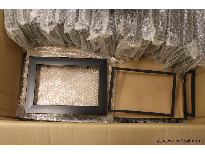Partij fotolijsten in doos; kleur zwart; aantal ca. 30 stuks; zie afbeeldingen.