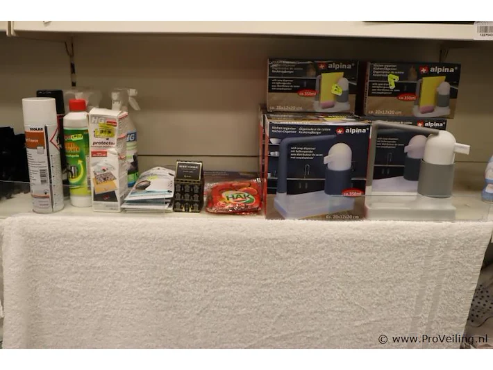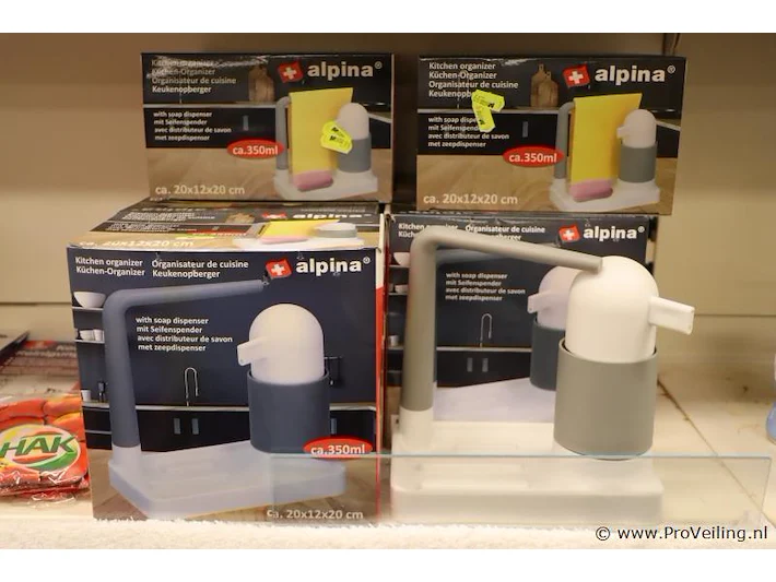 Partij diversen bestaande uit o.a. Alpina keukenopbergers met zeepdispenser, ontkalker & mondkapjes; zie afbeeldingen.