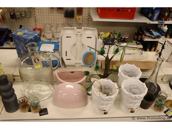 Woondecoratie bestaande uit o.a. glazen karaf, vaas & bloempotten; zie afbeeldingen.