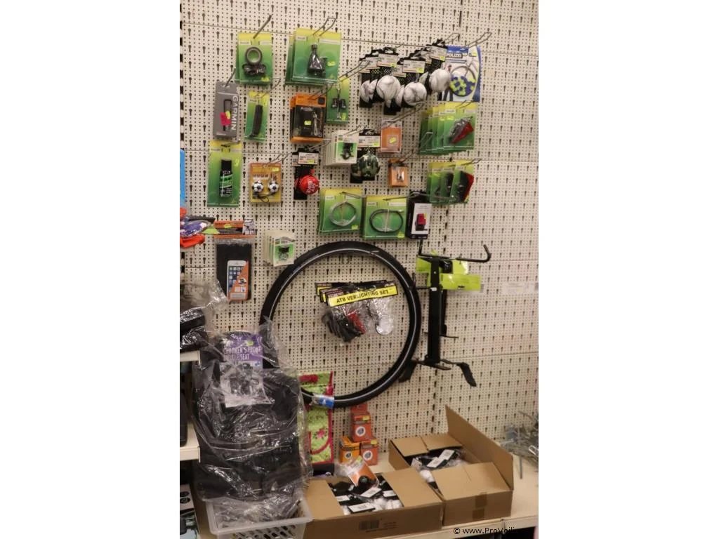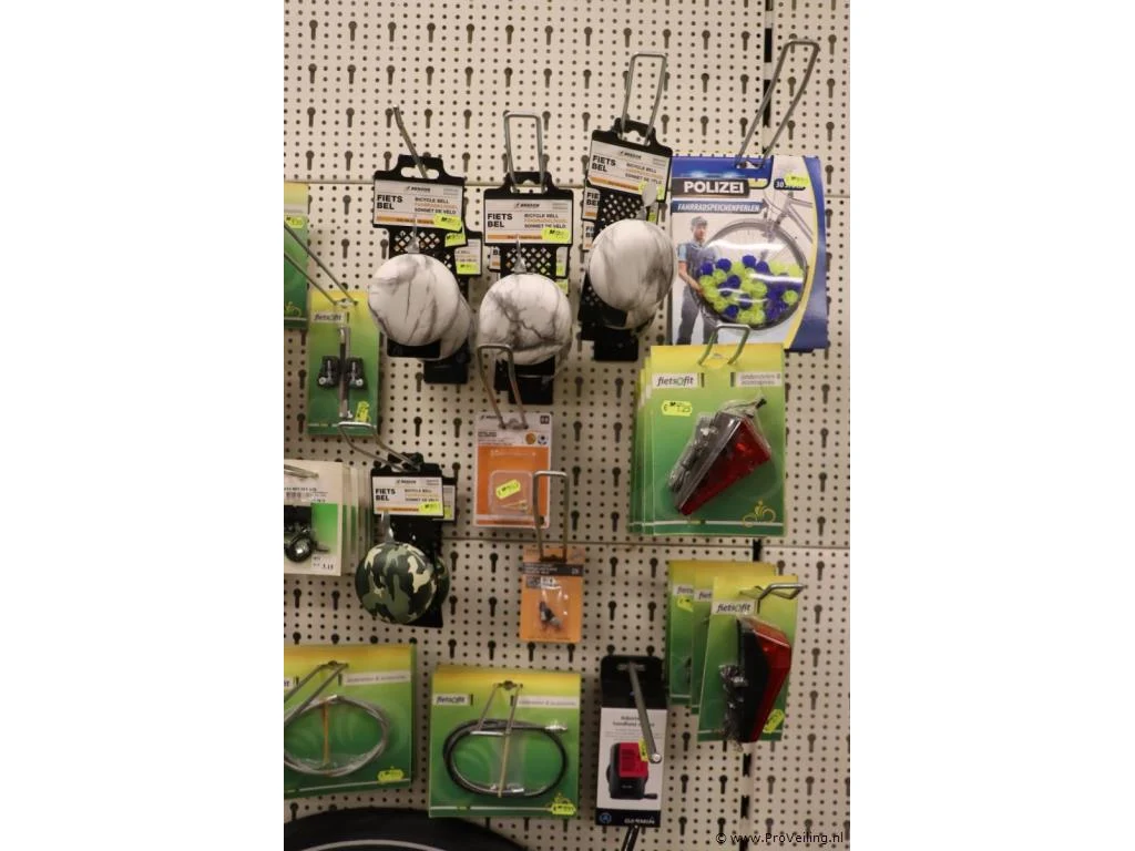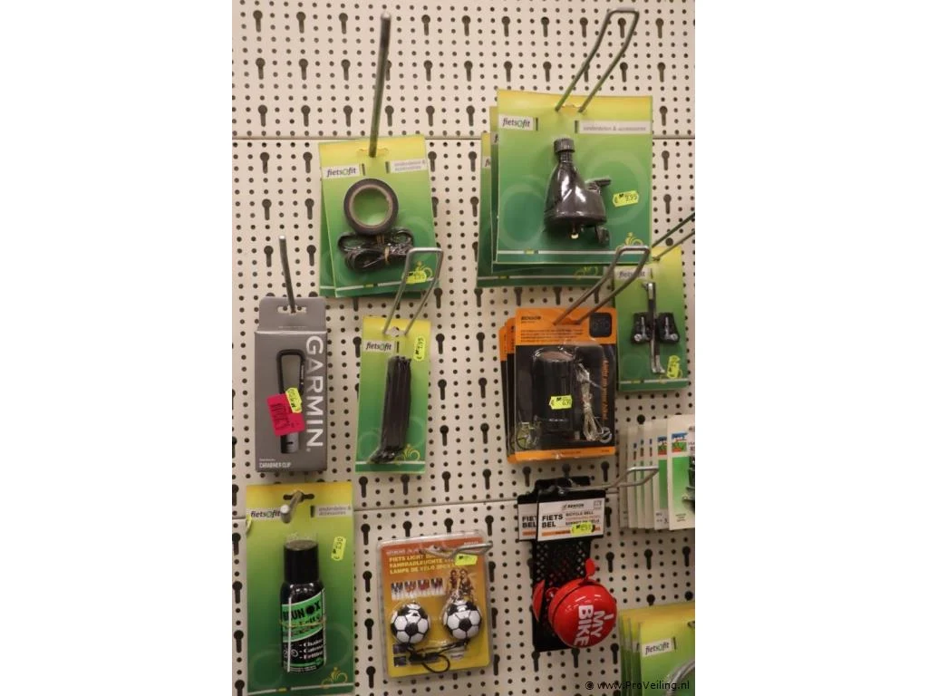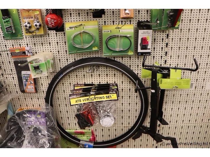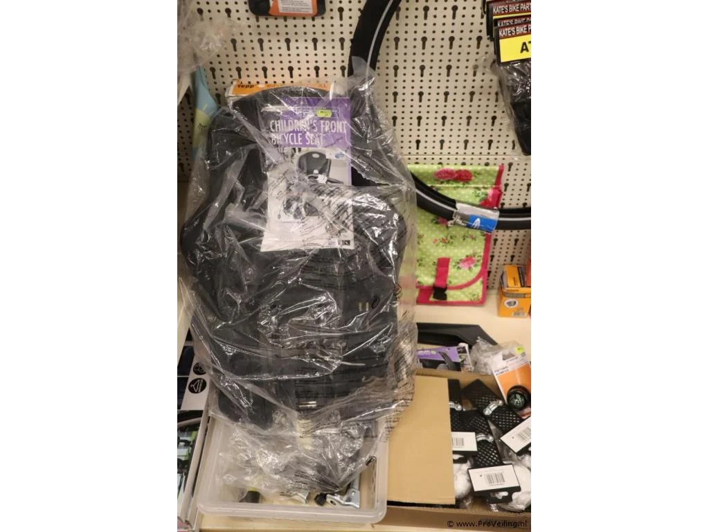 Partij fietsaccessoires bestaande uit o.a. fietsband, fietsbellen, atb verlichtingsets & kinderzitje