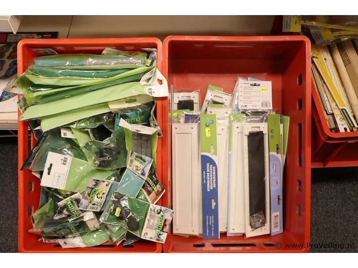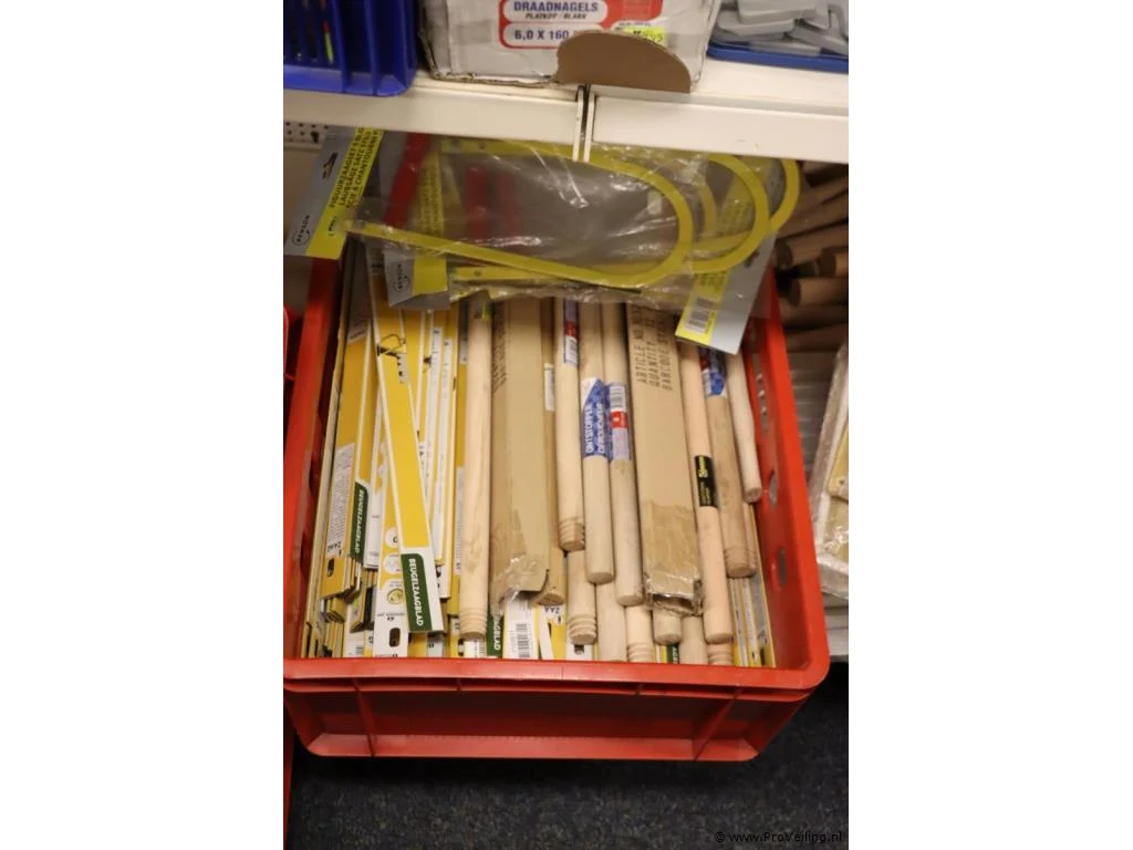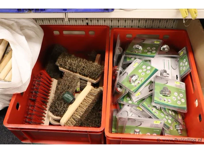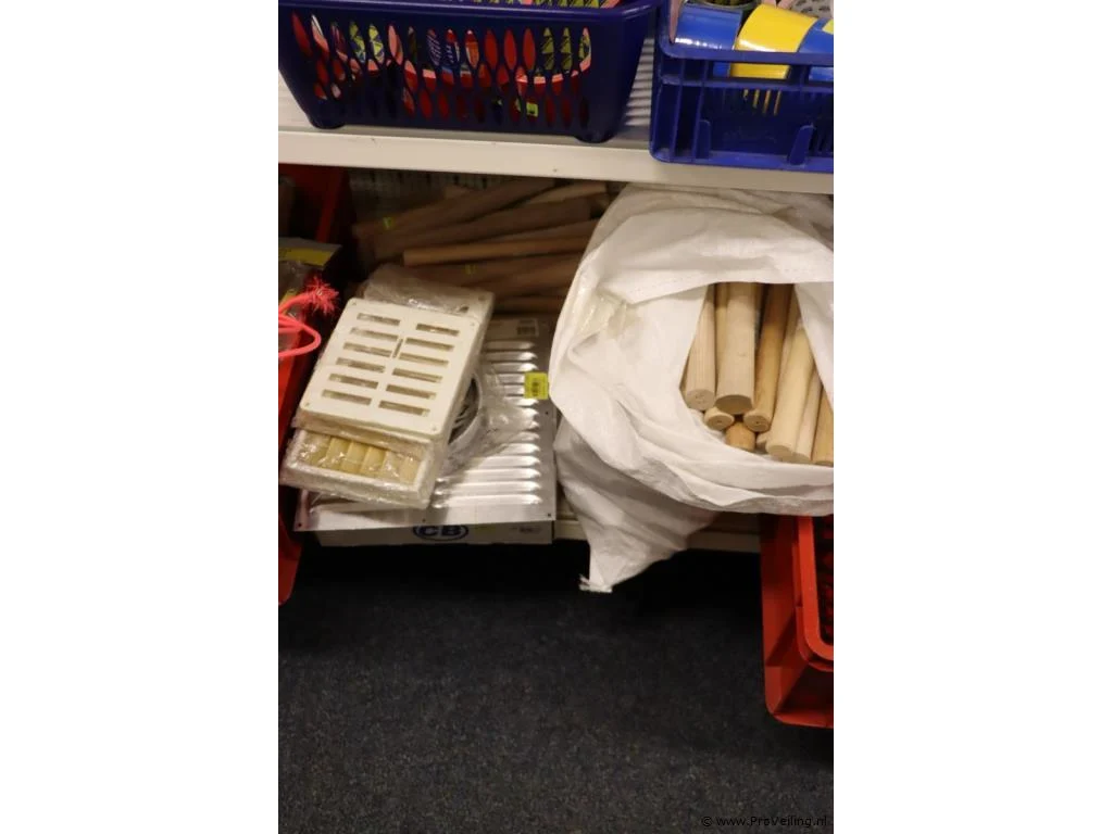 Partij diversen bestaande uit o.a. bezems, tochtafsluiter voor brievenbus, roosters & figuurzaagset; zie afbeeldingen. Excl. Rode kratten.