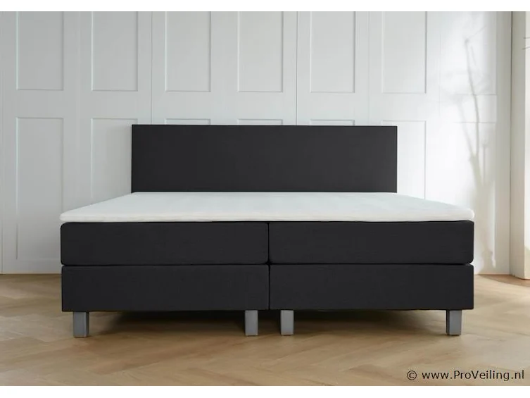 15651 Vlakke boxspring Turijn. Afmeting 180 x 200, Antraciet. Het hoofdbord is even breed als het bed (voorbeeld 180x100x8cm) de onderboxen zijn hard. Het matras bestaat uit 2 stuks. het matras is 7zone pocket geveerd. de topper is ca 5cm dik en is van het materiaal comfort schuim. de pootjes zijn grijs vierkant en 12 cm hoog.
