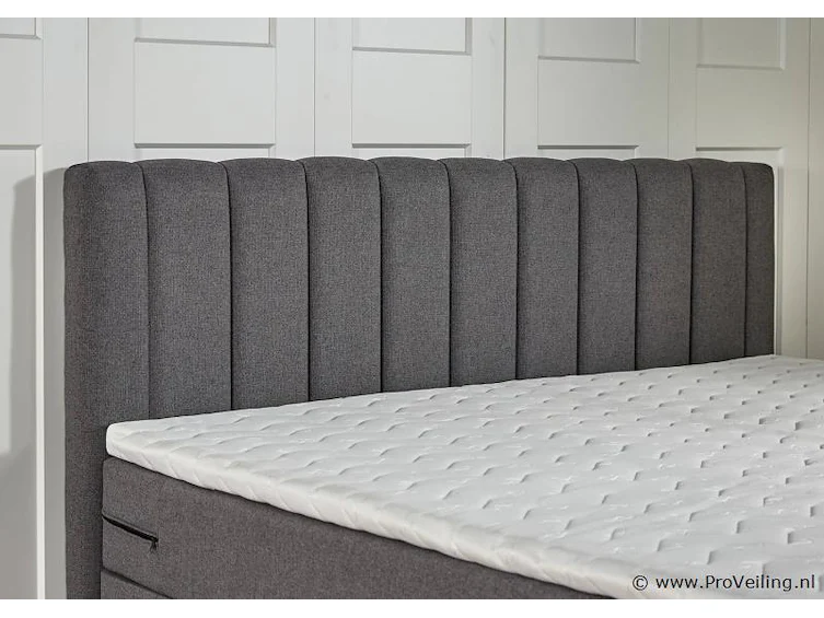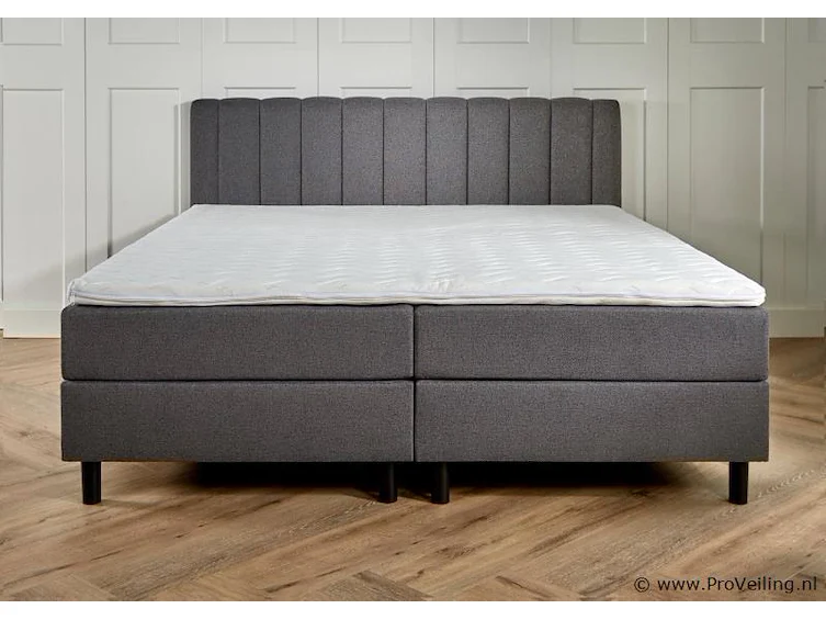16101 Vlakke boxspring lugano. Afmeting 180 x 200, Antraciet.Het hoofdbord is net iets breder als het bed ca 2cm aan beide zijde (voorbeeld 184x100x10cm). Het matras is 7 zone pocket geveerd. de topper is ca 5cm dik en het materiaal is comfort schuim. de onderbox is hard. De pootjes zijn van gehard plastic en 12cm hoog, de kleur is zwart rond. De instap hoogte is ca 58cm