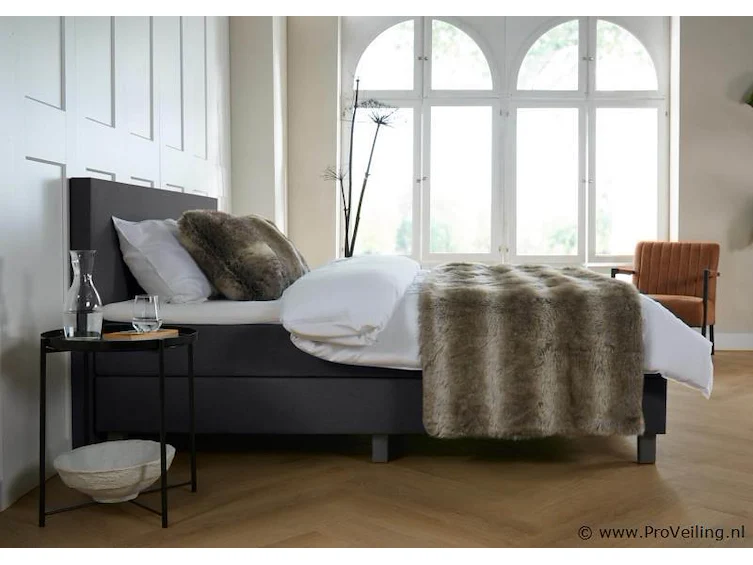 15651 Vlakke boxspring Florence. Afmeting 160 x 200, Antraciet.Het hoofdbord is even breed als het bed (voorbeeld 180x100x8cm) de onderboxen zijn hard. Het matras bestaat uit 1 geheel (140x200/160x200/180x200) het matras is 7zone pocket geveerd. de topper is ca 5cm dik en is van het materiaal comfort schuim. de pootjes zijn grijs vierkant en 12 cm hoog.