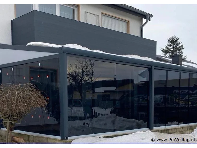 Schuifdeursysteem voor aanbouw, overkapping, veranda of tuinkamer, Compleet set met 6 stuks glasdeuren van 960 mm en boven- en onderrail, verstelbare glasprofielen, glasopvang-tochtprofielen en twee grepen 2550mm hoog ( min 2520 en max 2560 mm) breedte 5610 mm, breedte inkortbaar, kleur Mat zwart RAL 9005, Dit product wordt gratis thuisgeleverd ( 1 persoon moet helpen lossen)