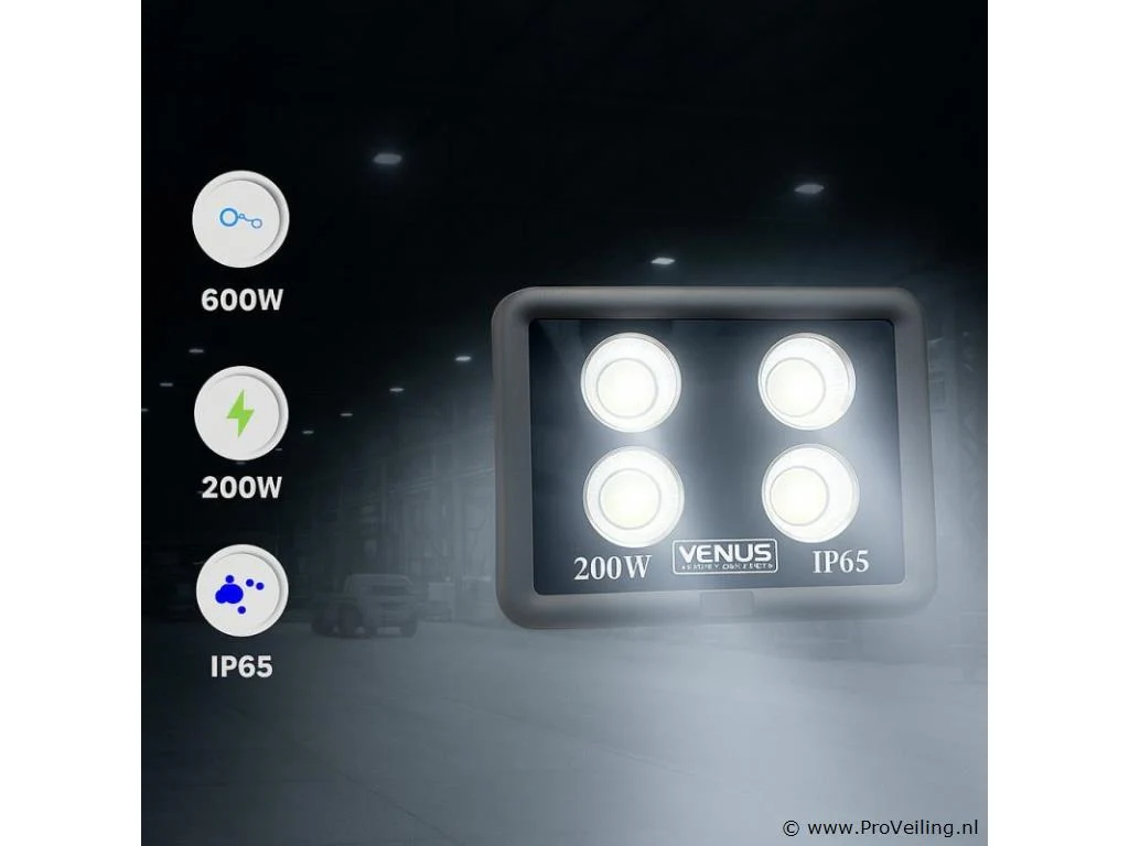 4 x LED-spot 200W – 6500K – IP65 – Krachtige LED-projector – Vermogen: 200W – Lichtstroom: 20.000 lumen – Kleurtemperatuur: 6.500K (koud wit) – LED-type: COB – Beamhoek: 120° – Kleurweergave-index (IRC): 80 Ra – Biedt intense en gelijkmatige verlichting voor grote oppervlakken – IP65 (beschermd tegen stof en waterstralen) – Inclusief LED-driver – Afmetingen: 420 x 316 x 70 mm – Spanning: 85-265V (50/60Hz) – Levensduur: 30.000 uur – Geschikt voor eenBinnen- en buitengebruik – Ideaal voor tuinen, gevels, magazijnen en industriële ruimtes.