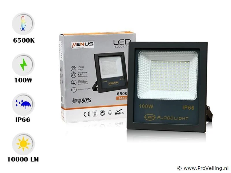 2 x LED-spots – Vermogen: 100W – Kleurtemperatuur: 6500K (koud wit) – Lichtstroom: 10.000 lumen – LED-type: SMD – Spanning: 85-265V (50/60Hz) – Afmetingen: 253 x 231 x 52 mm – Beamhoek: 120° – IP66 waterdicht –Levensduur: 30.000 uur – Inclusief LED-driver – Geschikt voor binnen en buiten – Ideaal voor het verlichten van grote oppervlakken.