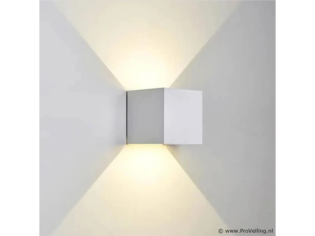 6 x Bidirectionele LED wandlamp – Model: SW-2312-2 – Vorm: kubus – Vermogen: 2 x 5W – Lichtstroom: 900 lm – Kleurtemperatuur: 3500K (witNeutraal) – IRC: 75 – Beamingshoek: 120° – Hoogwaardig aluminium – Kleur: wit – Waterdicht: IP54 – Beschermd tegen stof en spatwater – Compacte afmetingen – LED COB-technologie – Instelbaar – Levensduur: 30.000 uur – OppervlaktedrukN: 85-265V (50/60Hz) – Inclusief lichtbron – Geschikt voor binnen en buiten.